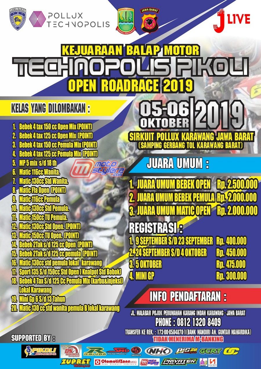 Menilik seputar persiapan seluruh panitia, Technopolis Pikoli Open Race dipastikan menyuguhkan laga seru di tengah masyarakat Karawang yang notabene selalu antusias di setiap perhelatan balap kuda besi. So, buat yang belum bergabung, pendaftaran masih terbuka lebar dengan menghubungi CP 081213208409, Transfer ke Bank Mandiri (norek 173000504878 AN Guntar Mahardika) Tidak Menerima M-Banking, atau datang langsung ke sekretrariat di Jalan Malabar Pojok Perumahan Karang Indah Karawang. Jangan sampai terlewatkan dan mari bersama sukseskan gelaran Technopolis Pikoli Open Road Race, Karawang. Rob