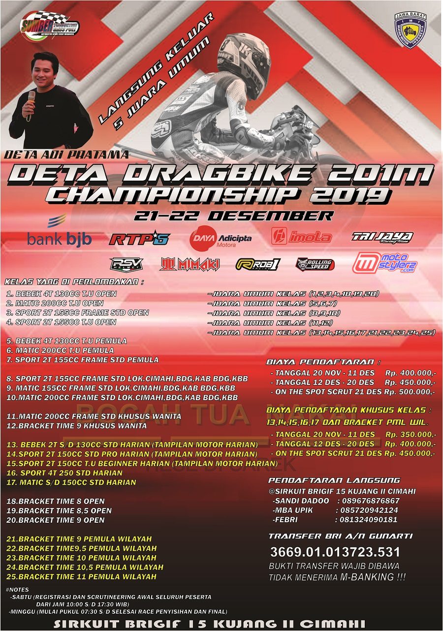 So, mari bersama sukseskan hajatan Deta Drag Bike 201M Championship dengan menghubungi contact person panitia di nomor 089676876867 (Sandi Dadoo), 085720942124 (Mba Upik), 081324090181 (Febri) atau transfer ke Bank BRI 3669.01.013723.531 atas nama Gunarti (Tidak Menerima M-Banking), maupun bisa datang langsung ke Sirkuit Brigif 15 Kujang II Cimahi. MS-1
