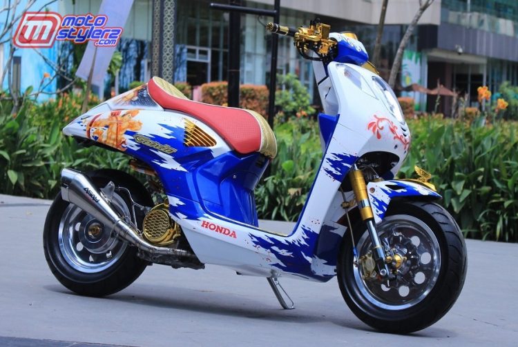 “Inspiriasinya jelas dari bejekan moge balap manca café racer, berikut ditandem grill jabelan Supra X125, lengkap dengan single seat yang membuat bodi belakangnya yang kini terlihat lebih sekseh, diikuti fender eks CBR150, sekaligus seni tato realis airbrush bertemakan Culture Of Indonesia,”jelas Modifikator bersapaan Tito Gejek. Melengkapi perubahan perdana maskot sayap tunggal miliknya, kembali sentuhan minimalis penuh gengsi dilakoni bareng stang ori beramunisi asesoris riding, seperti handgrip Fast Bike serta handle dan master rem yang glamour bersepuh gold blink blink by Chepy CKAM Modified.