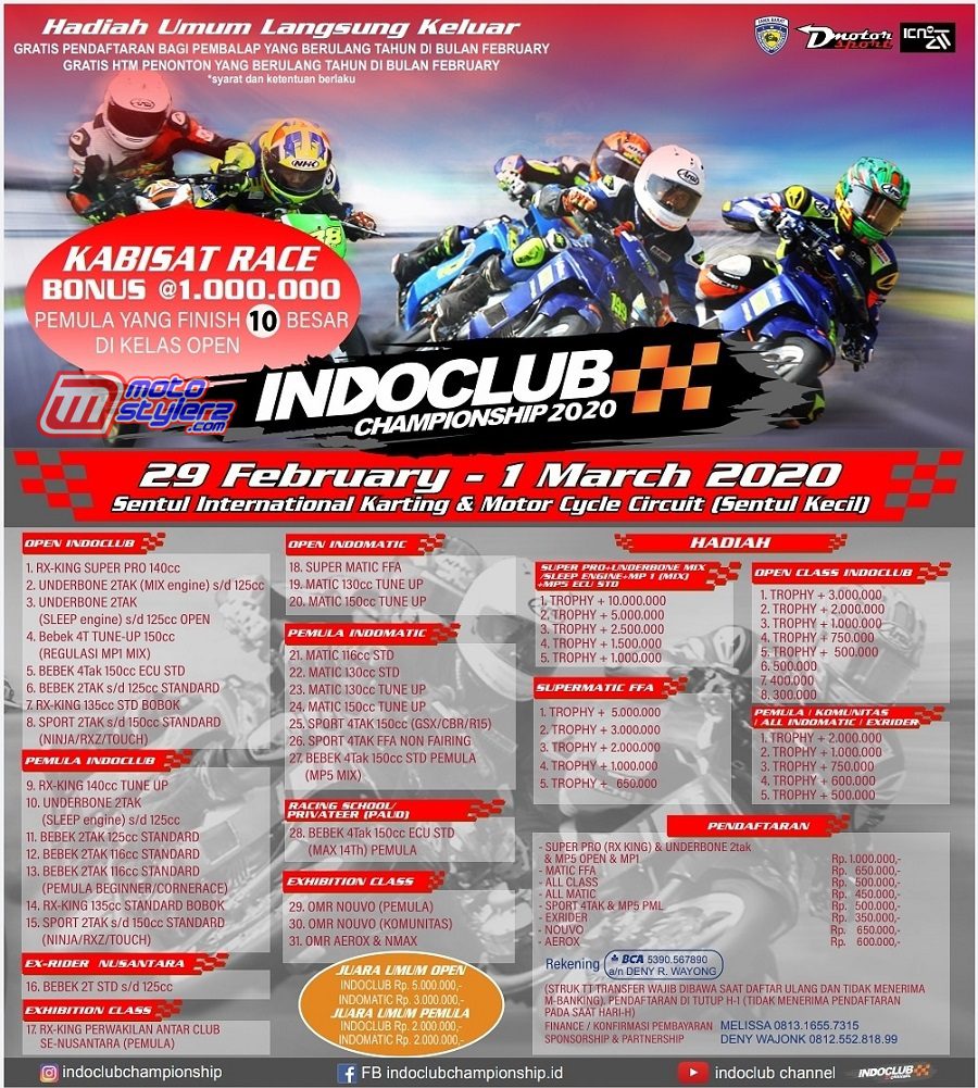 Akhir pekan ini or tepatnya Sabtu & Ahad (29 Februari-1 Maret 2020), Indoclub Championship  bakalan segera bergulir. Kasta tertinggi club event roadrace di indonesia ini memang selalu layak dinanti pecinta roadrace seantero negeri. Pasalnya, gelaran yang di motori Deny Wajonk memang tidak main-main dalam hal kemasan, sekaligus loyalitas yang tidak diragukan lagi bagi para racer, sehingga gelaran ini dipastikan kerap jadi even terfavorit.