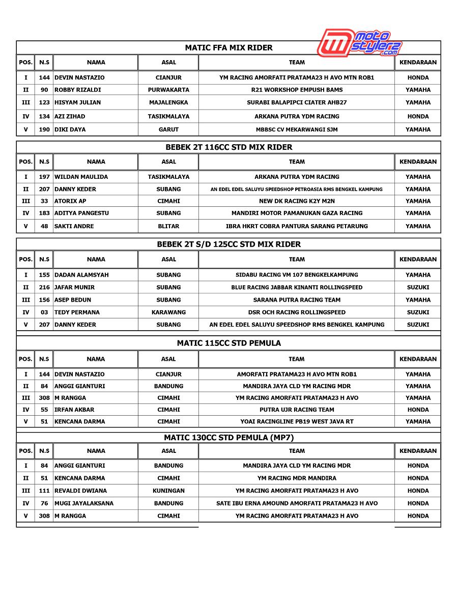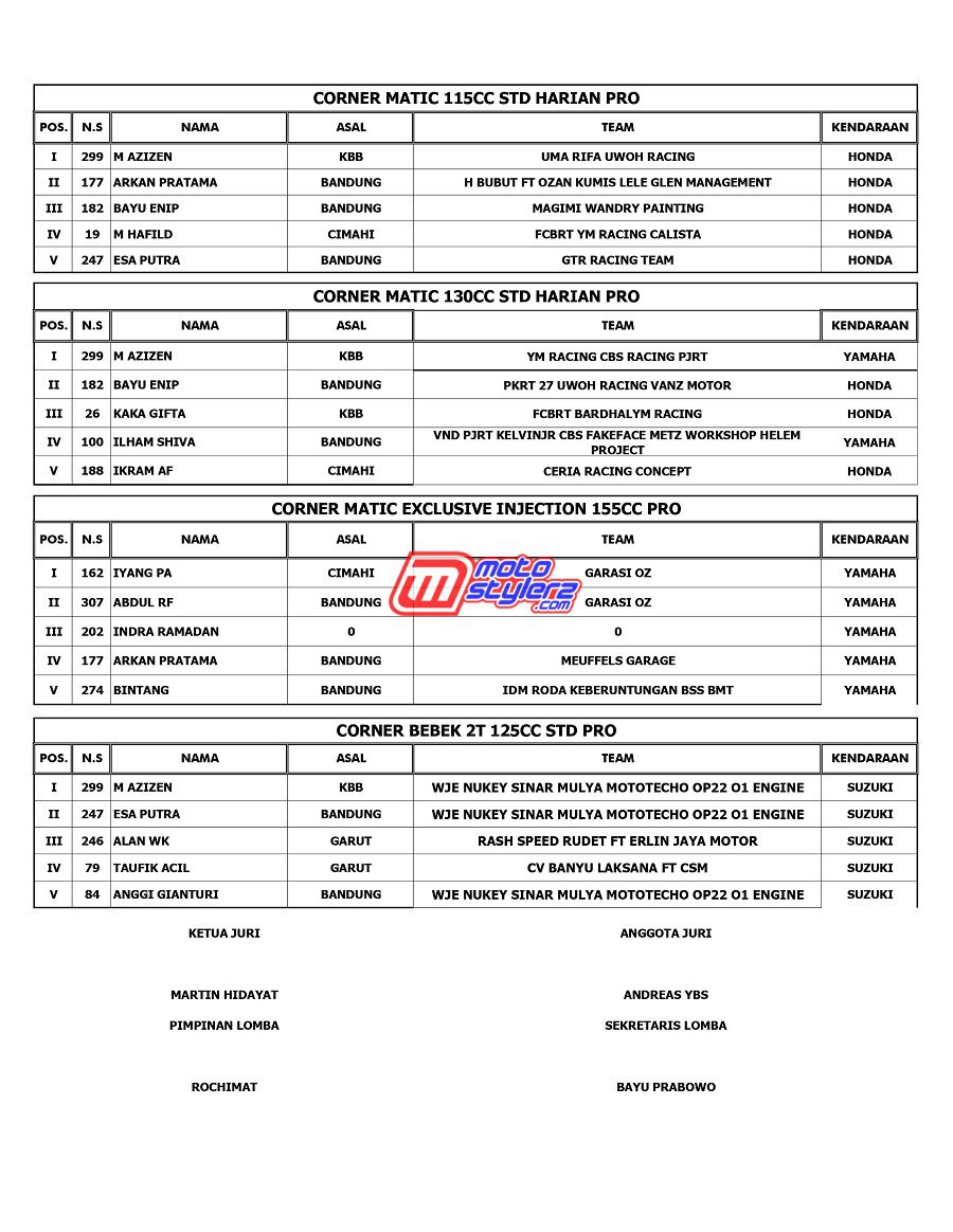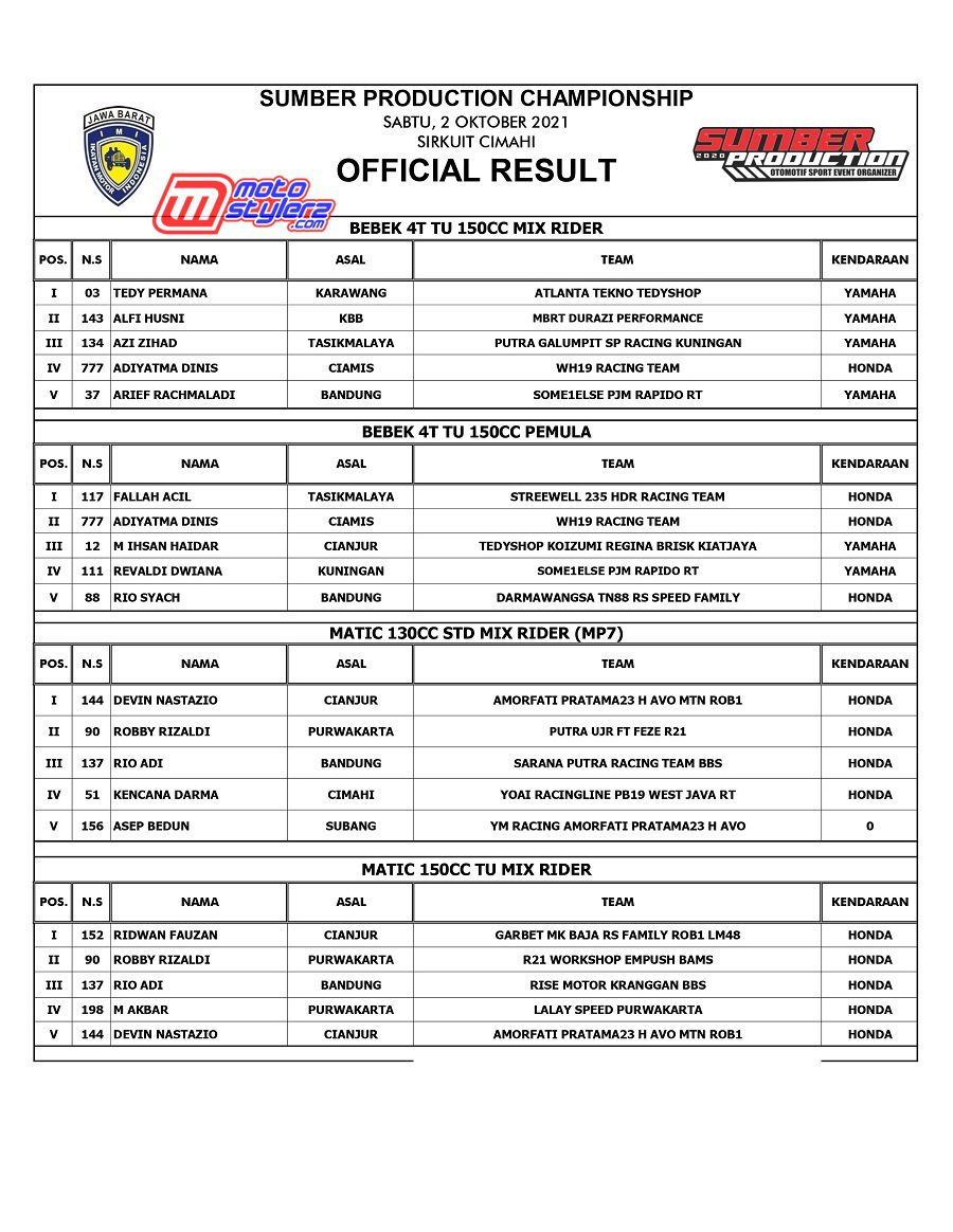 Event bertajuk Sumber Production Championship akhirnya kembali menyapa pencinta road race & cornerace Jawa Barat. Pastinya kemasan promotor Sumber Production yang berlangsung sukses 1-2 November di Sirkuit NP Brigif Cimahi. Berikut hasil lengkap juaranya. /Nuadjah