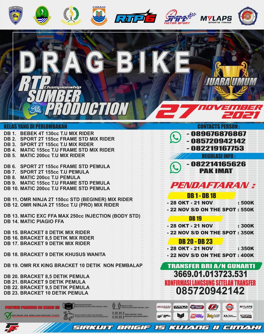 Menggelar total 23 kelas, gelaran balap di trek lurus yang turut di support H. Rio Teguh Pribadi tersebut akan mempersembahkan 3 kategori terbaik alias juara umum, yaitu juara umum Mix Rider, Best Time serta Best Rider.