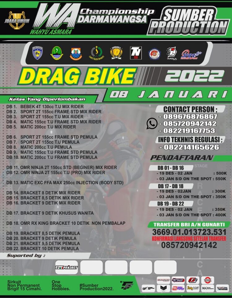 Sementara itu Sandi Dadoo selaku kordinator event dari Sumber Production menambahkan jika WA Darmawangsa Sumber Production Drag Bike Championship total mempertandingkan 22 kelas yang hampir semuanya dipastikan menjadi favorit peserta, baik joki seluruh wilayah Jabar maupun stater langganan luar provinsi, seperti DKI, Banten hingga Jateng atau Jogja.