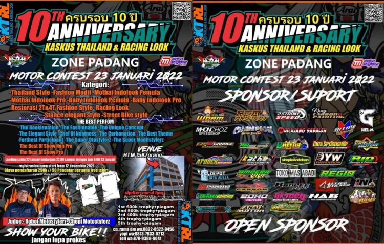 Kalender motocontez 2022 beberapa pekan lagi siap menyapa modifstylerz Sumatera Barat. Hal ini terkait dengan kepastian keluarga besar Kaskus Thailand & Racing Look Zone Padang yang pada hari Ahad (23 Januari) mendatang dipastikan menghelat agenda tahunan bareng tajuk 10th Anniversary KTRL Zone Padang.
