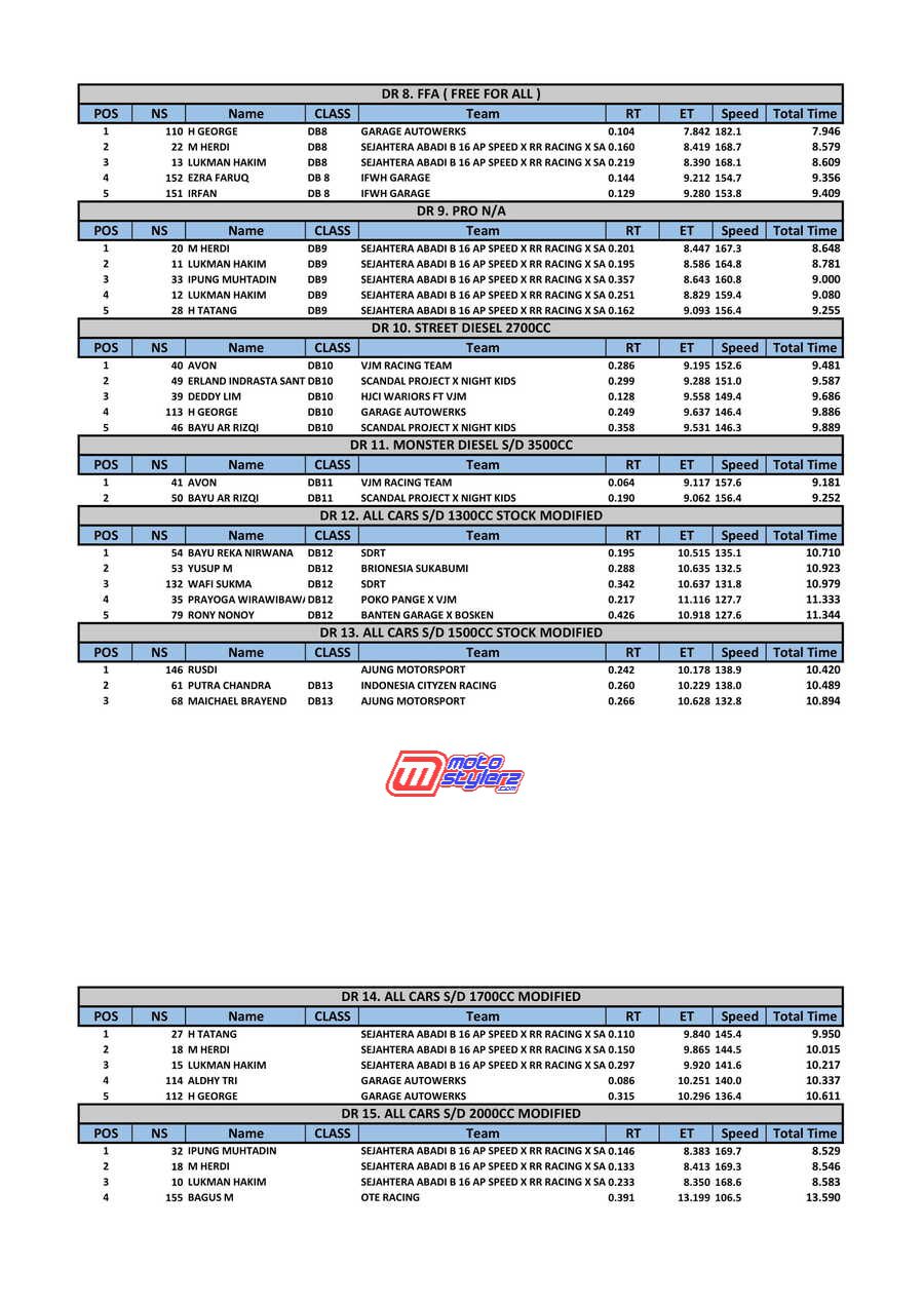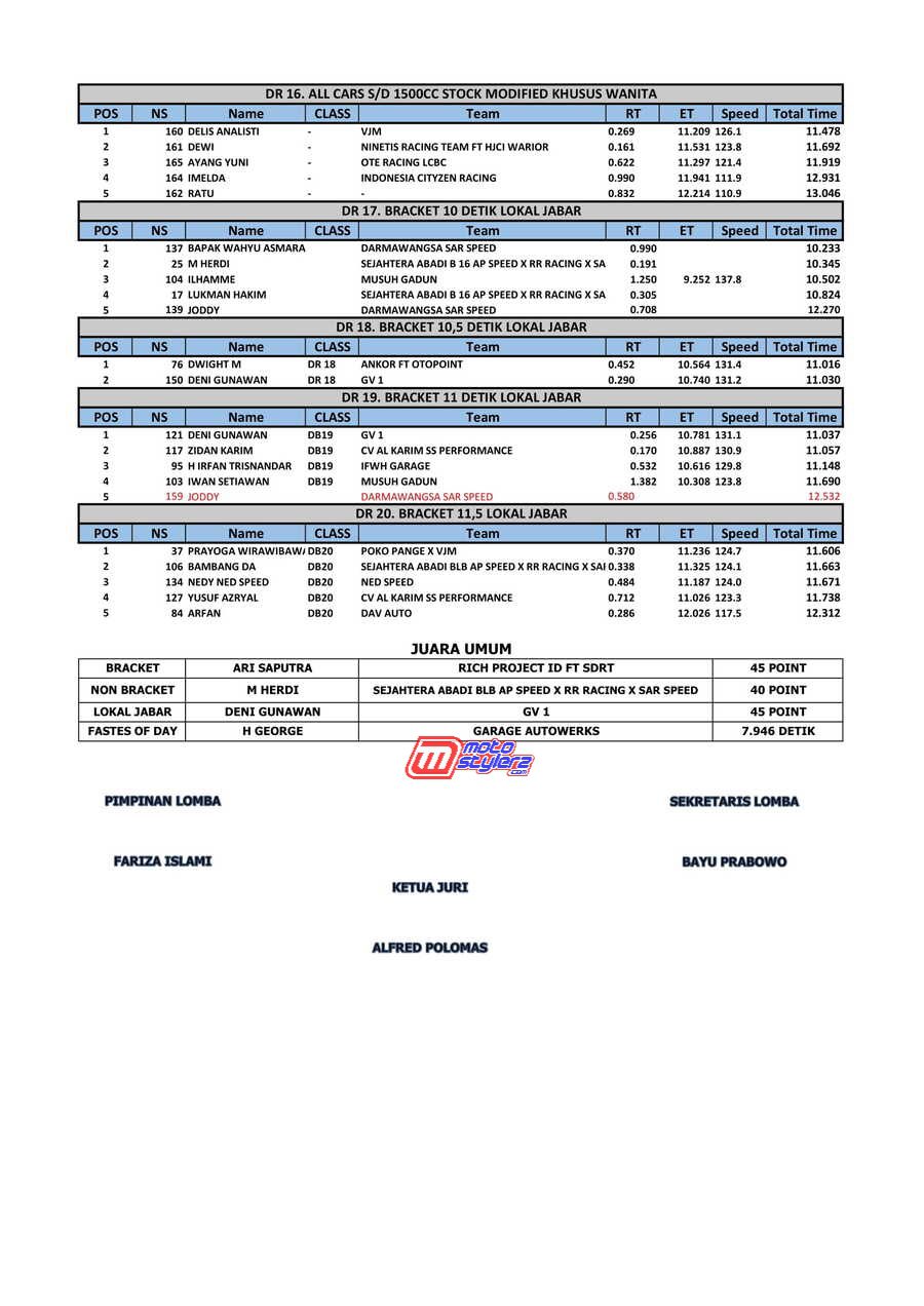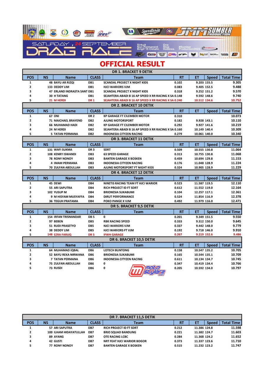 Berikut merupakan hasil lengkap kejuaraan Drag Race JMM Sumber Production, persembahan Sumber Agung Rizki yang dihelat sukses pada hari Sabtu (24 September 2022) di lintasan Brigif 15 Kujang II Cimahi./Borz