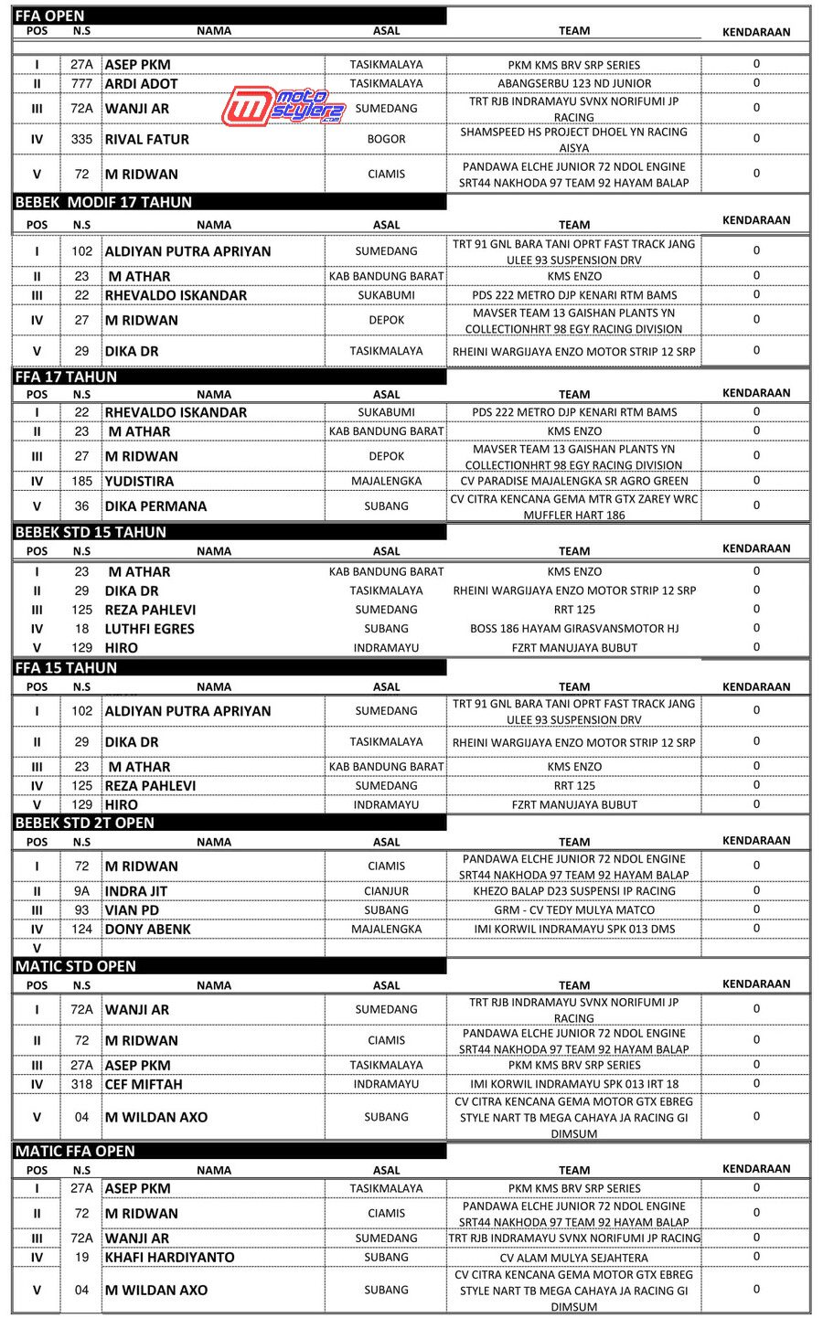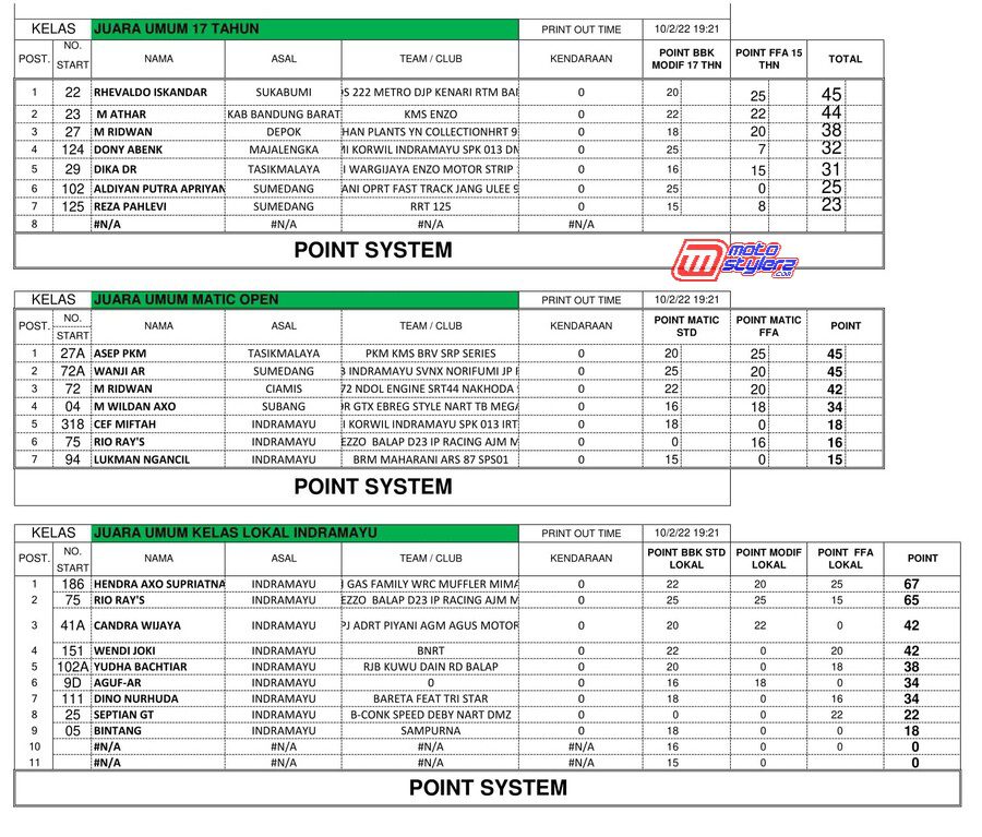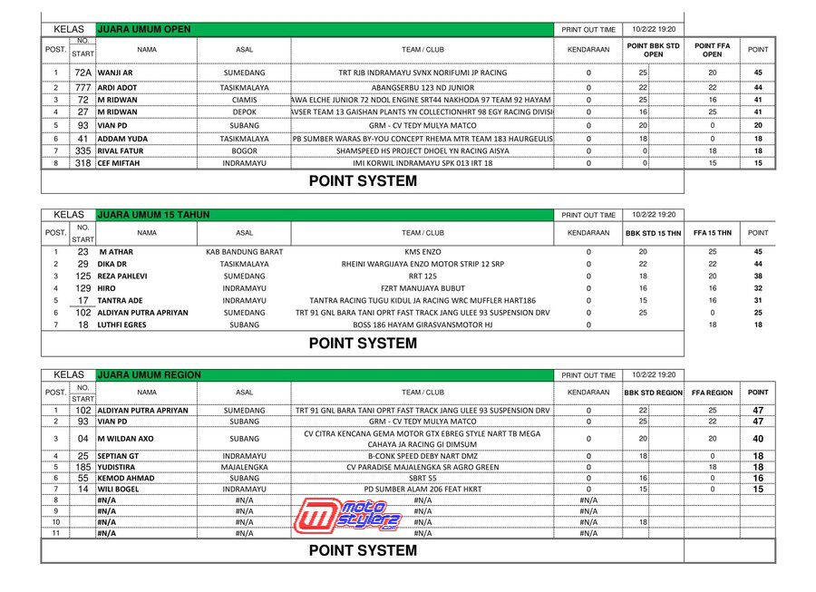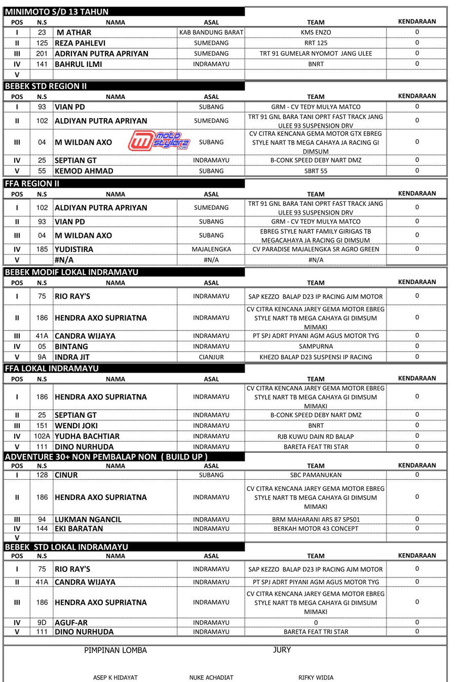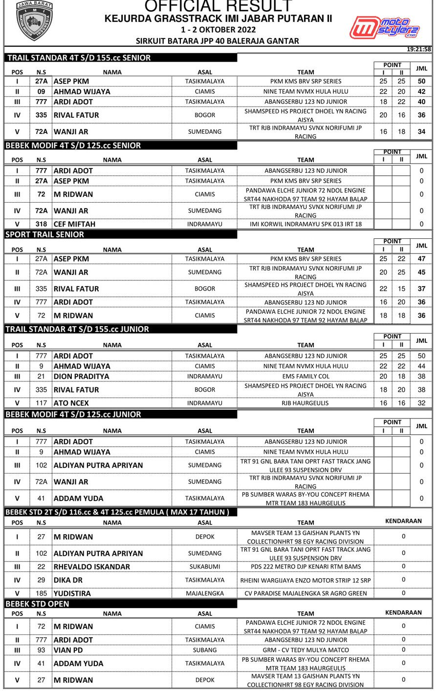 Berikut hasil lengkap Kejuaraan Daerah (Kejurda) Grasstrack IMI Jabar Putaran 2 yang berlangsung sukses, Minggu (2 Oktober 2022) di Sirkuit Batara JPP 40 Baleraja Gantar, Kabupaten Indramayu. /Nuadjah