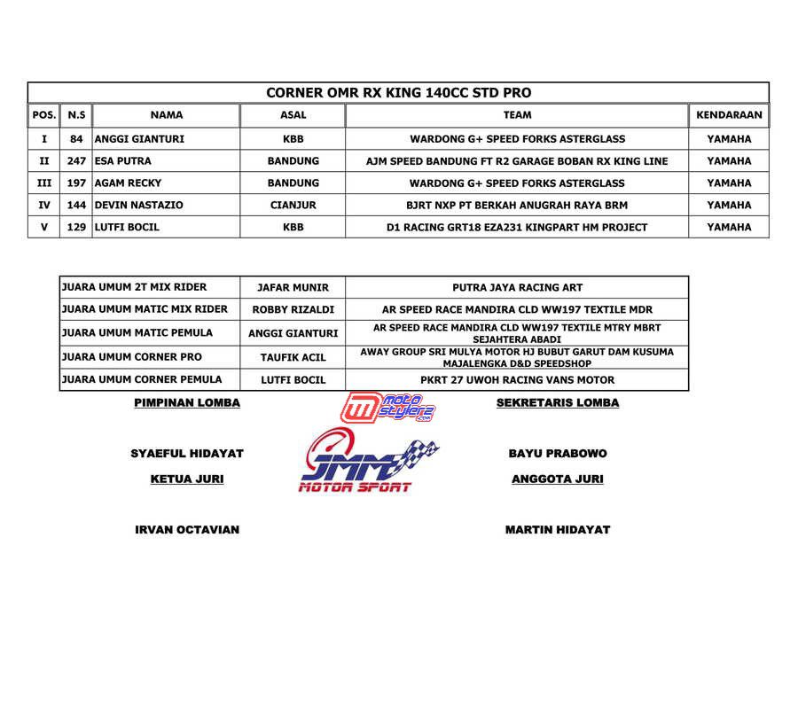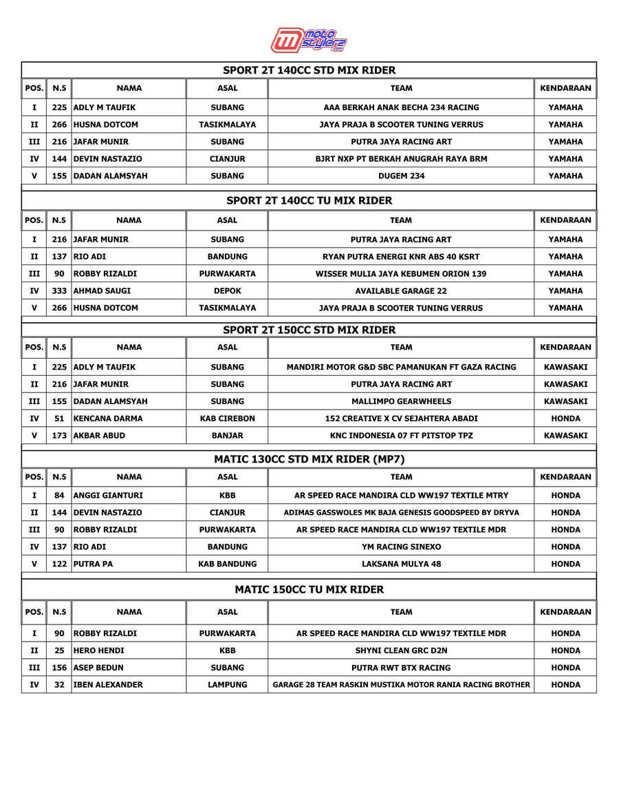 Berikut hasil lengkap event road race bertajuk Sumber Production Championship, persembahan Sumber Agung Rizki yang dilangsungkan sukses pada hari Sabtu (8 Oktober 2022) di sirkuit NP Brigif 15 Kujang II, Cimahi. /Robz