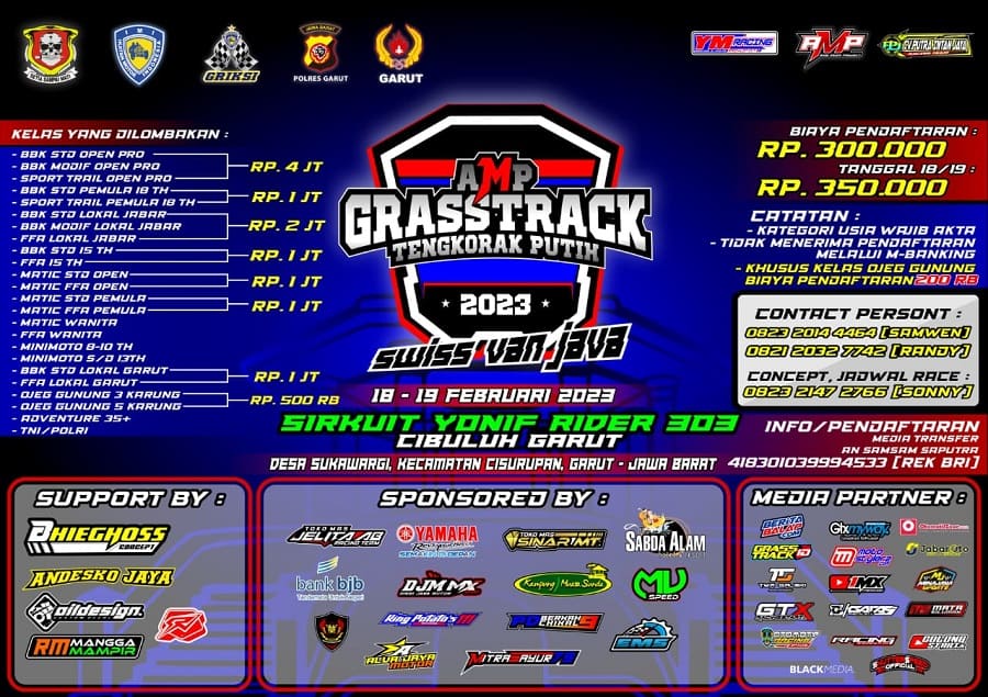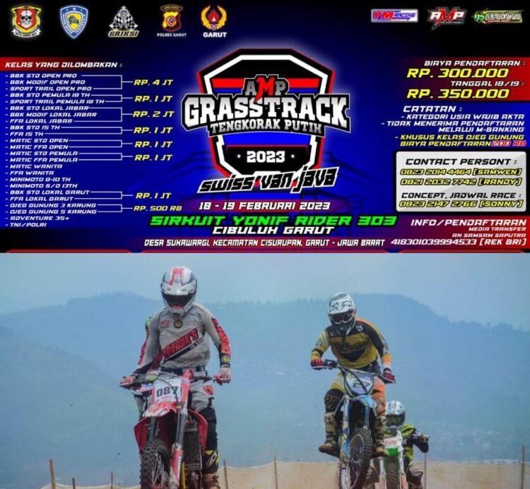 Siap siap nih buat grasstracker tanah air, khususnya diwilayah Garut dan sekitarnya untuk menyambut perhelatan akbar balap garuk tanah bertajuk YM Racing AMP Grasstrack Tengkorak Putih 2023 Swiss Van Java yang akan dilangsungkan 18-19 Februari mendatang.