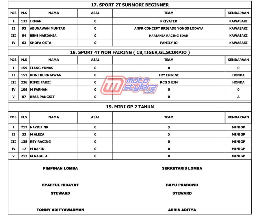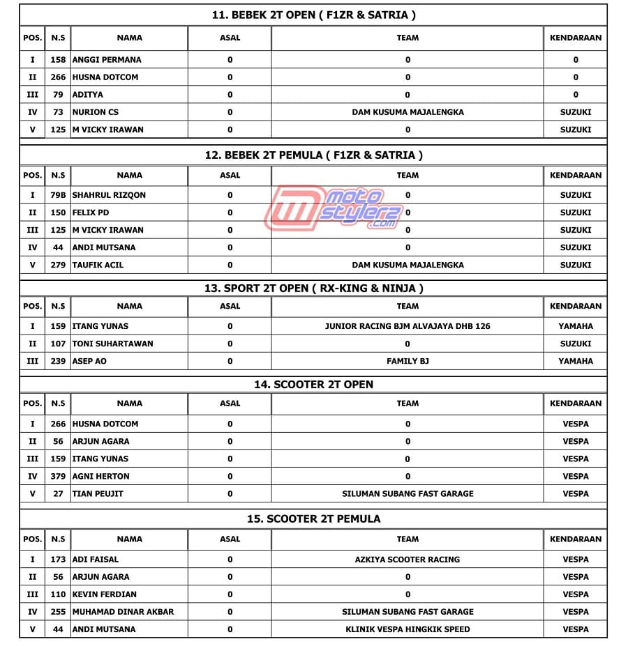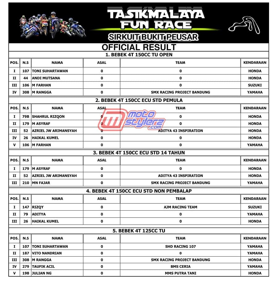 Berikut merupakan hasil juara lengkap event bertajuk Tasikmalaya Fun Race, persembahan Uciel Deo yang berlangsung sukses, Minggu (25/6-23) di Sirkuit Bukit Peusar, Tasikmalaya. /Fachmi