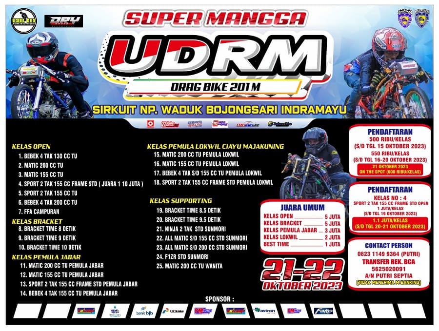 Bukan itu saja, Super Mangga UDRM Drag Bike 201M juga akan diserukan 4 titel juara umum, seperti JU Open berhadiah 5 Juta, JU Bracket (5 Juta), JU Pemula Jabar (3 Juta), JU Lokwil (2 Juta) dan so pasti Best Time yang memeperebutkan 1 Juta.