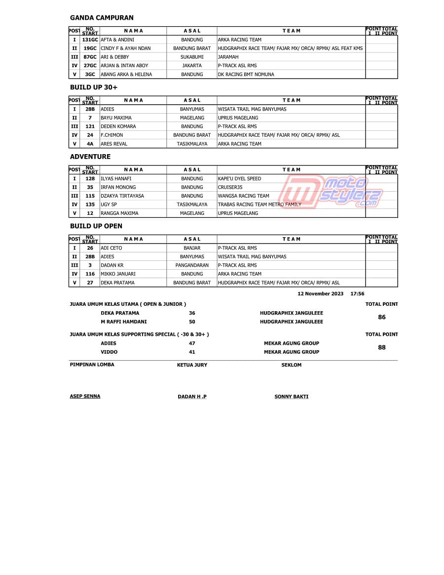 Berikut adalah hasil juara lengkap kejuaraan bertajuk Kejurda Jabar Enduro Seri 3 yang berlangsung sukses, Sabtu & Minggu (11-12 November 2023) di Sirkuit Siliwangi, Bandung. /SF