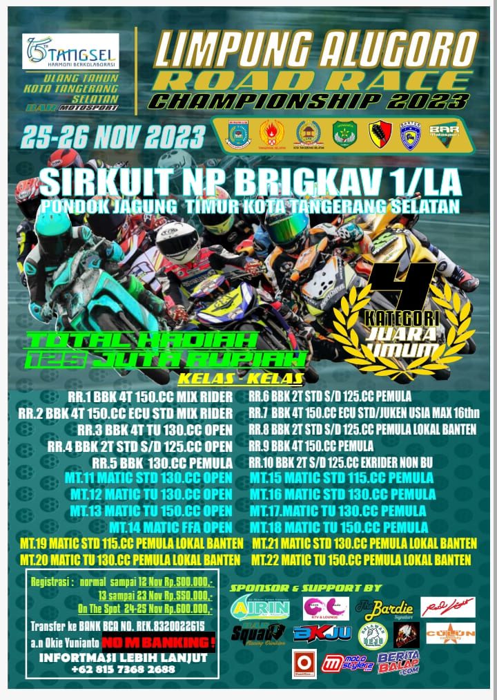Promotor BAR Motorsport memastikan diri siap menghelat kejuaraan balap motor bertajuk Alugoro Road Race Championship dalam rangka memeriahkan Hari Jadi Kota Tangerang Selatan. Pelaksanaan even dihelat Sabtu & Minggu (25-26 November 2023) dengan mendaulat Sirkuit NP Brigkav 1/LA, Pondok Jagung Timur Kota Tangsel.
