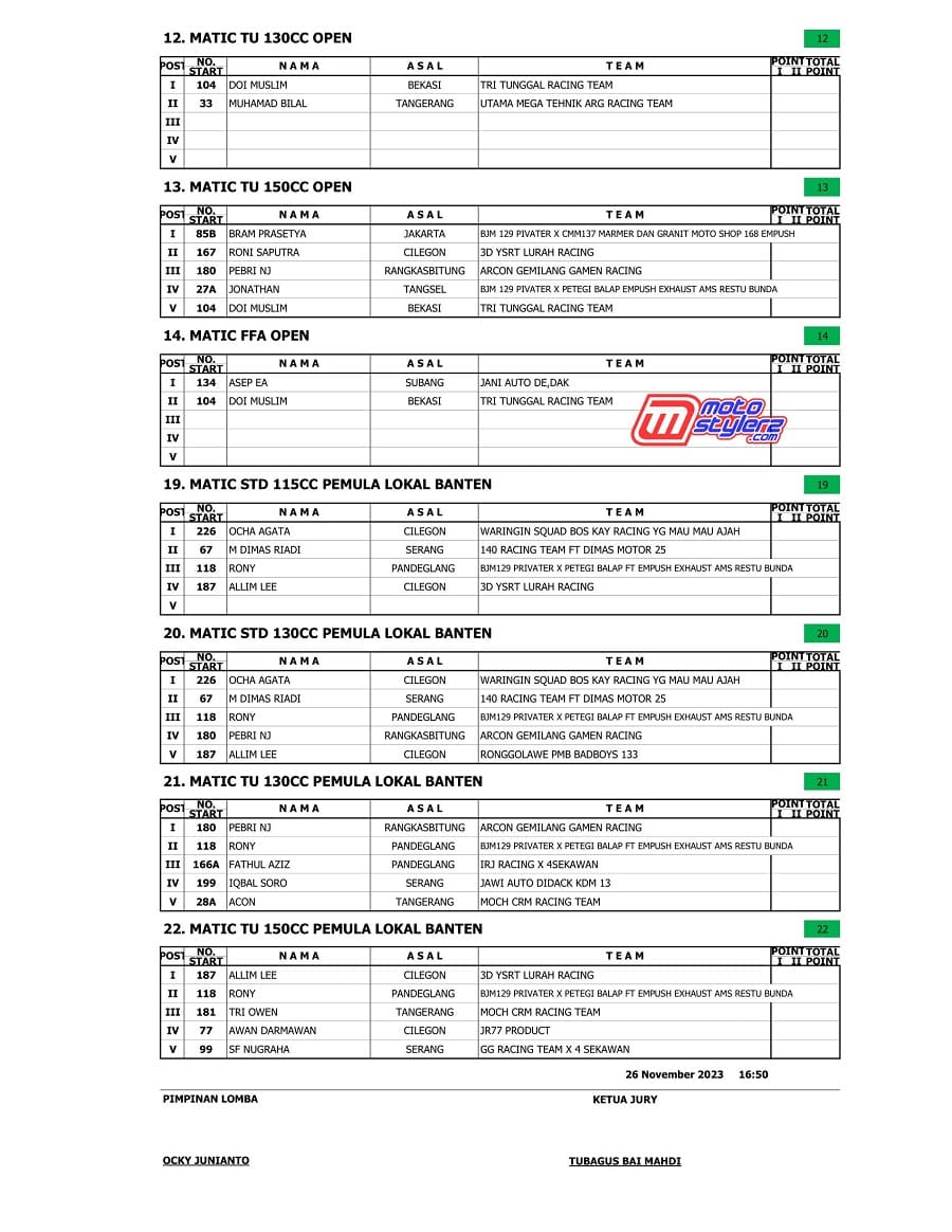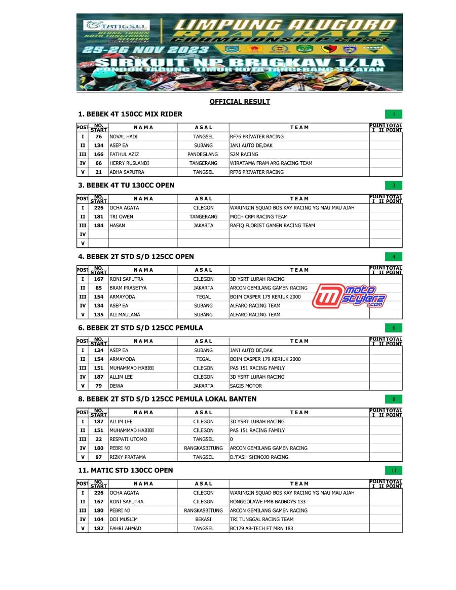 Berikut adalah hasil juara lengkap event bertajuk Limpung Alugoro Road Race Championship, persembahan BAR Motorsport dalam rangka memperingati hari jadi Hari Jadi Kota Tangerang Selatan, Minggu (26 November 2023) di Sirkuit NP Brigkav 1/LA, Pondok Jagung Timur Kota Tangsel. /Yan RS