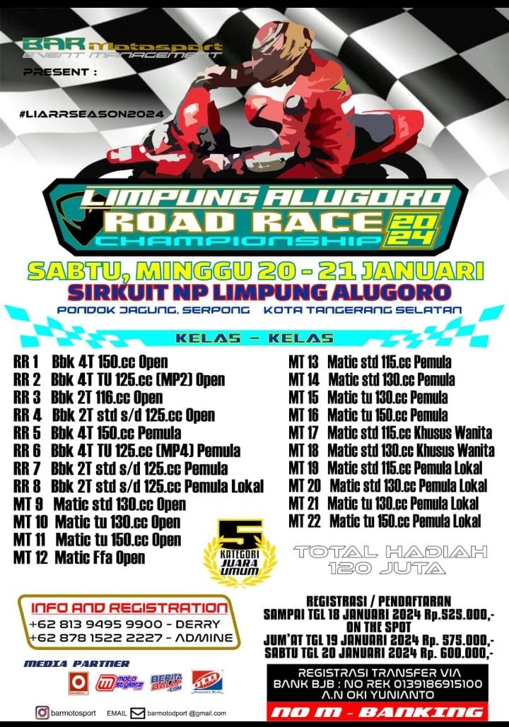 Sementara itu bagi yang belum bergabung, pendaftaran sudah dibuka dengan mahar 525K sampai batas 18 Januari. Sedangkan harga 575K berlaku saat OTS (Jumat, 19 Januari) dan harga 600K untuk hari Sabtu (20 Januari). So, segera merapat dan mari sukseskan Limpung Alugoro Road Race Championship. /MS