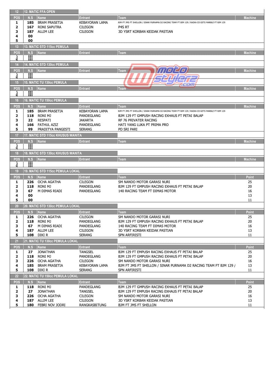 Berikut merupakan hasil juara lengkap di event Limpung Alugoro Road Race Championship, persembahan BAR Motorsport, Minggu (21/1) di Sirkuit Non Permanen Brigkav 1/LA, Serpong, Kota Tangerang Selatan. /MS