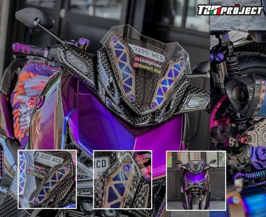 Buat area depannya, si “Cuplis” mengandalkan TZM Project 2 Layer Construction Titanium Windshield Bracket a.k.a TZM Project Bracket Windshield Titanium. Parts special ini tentunya sudah dibekali design eksentrik dan unik, mengimbangi aura big skutic XMAX. Sementara Bracket Windshield Titanium dari TZM Project ini sontak memberikan highlights padat untuk tampang depannya.