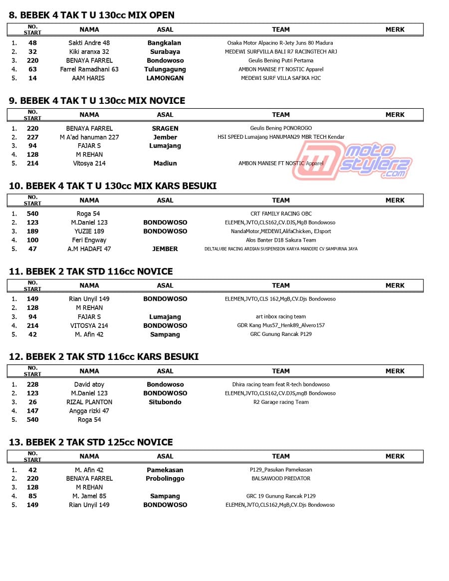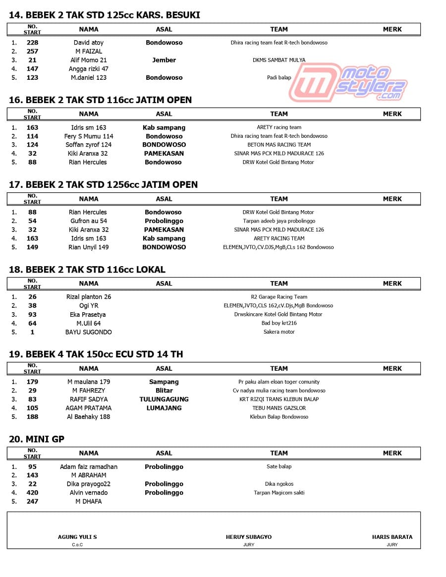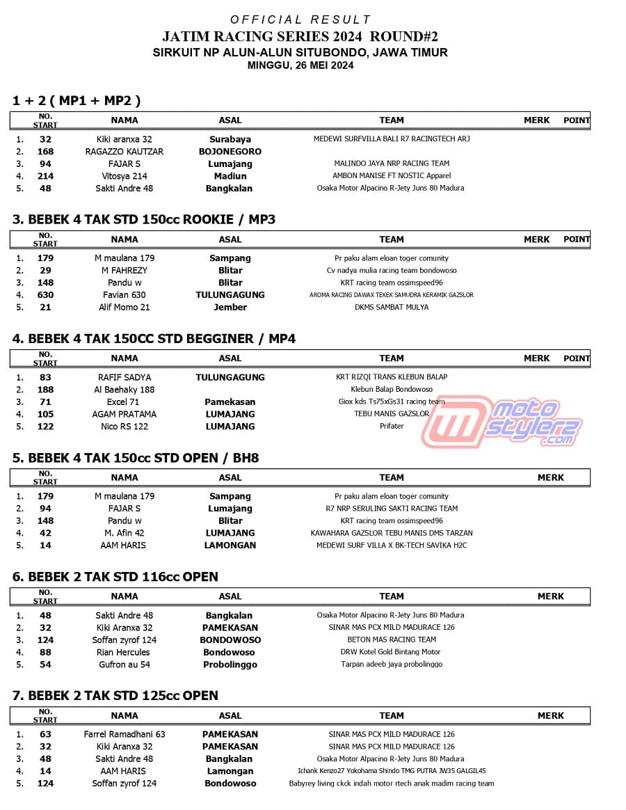 Berikut adalah hasil road race bertajuk Jatim Racing Series Round 2 yang berlangsung sukses dihelat Minggu (26/5) 2024 di Sirkuit NP Alun Alun Situbondo, Jawa Timur. /MS