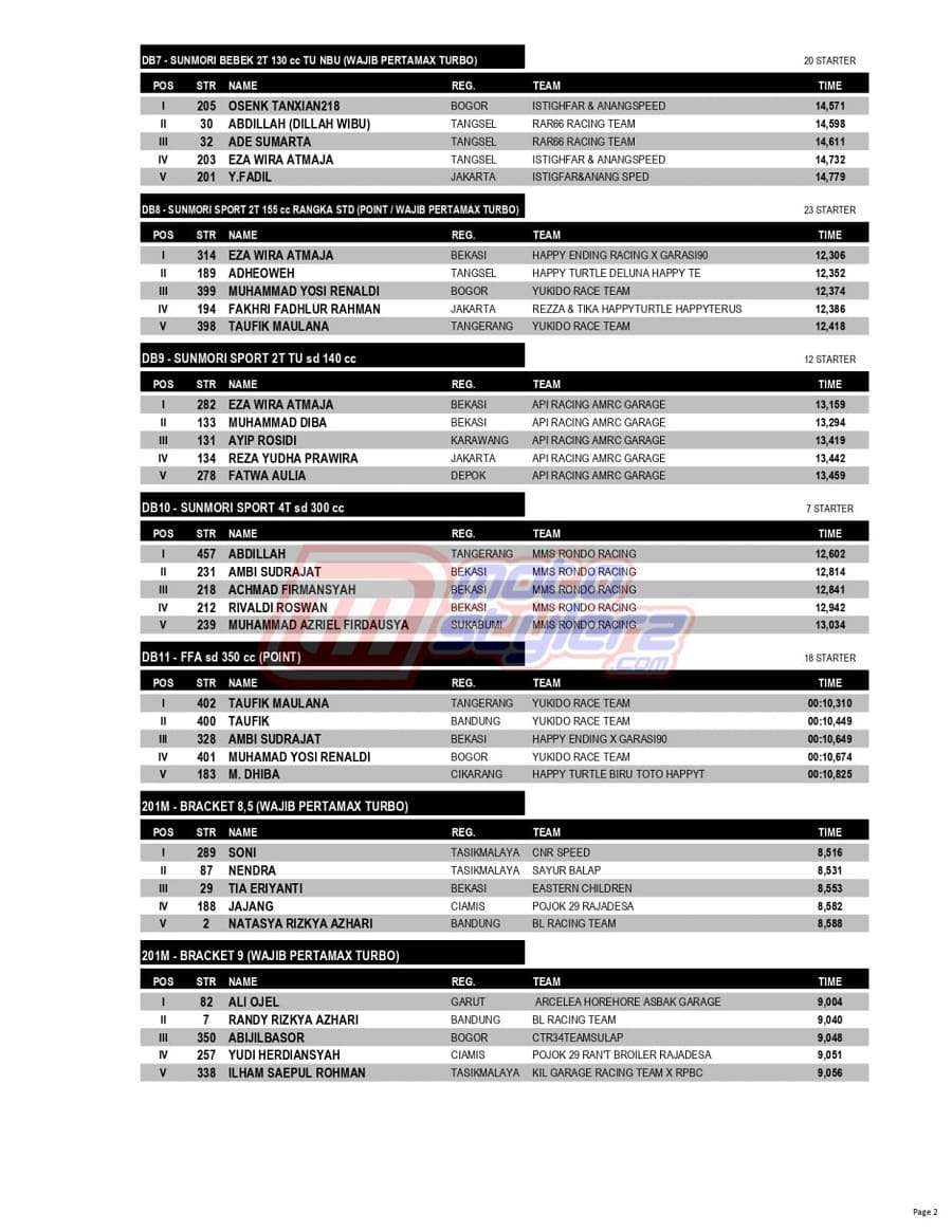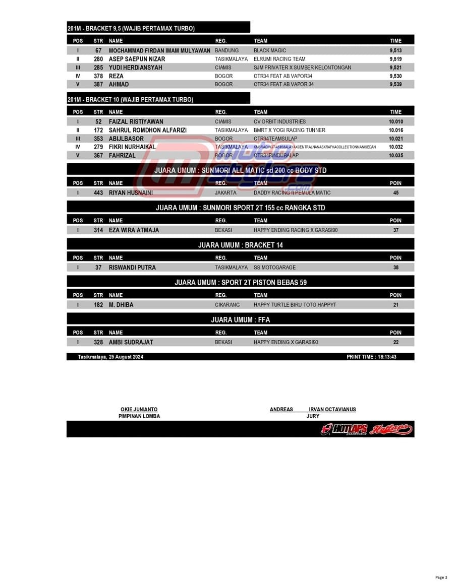 Berikut adalah hasil juara lengkap event bertajuk Pertamax Turbo Drag Fest yang berlangsung sukses, MInggu (25 Agustus 2024) di Sirkuit NP Lanud Wiriadinata, Tasikmalaya, Jawa Barat. /Threyadi