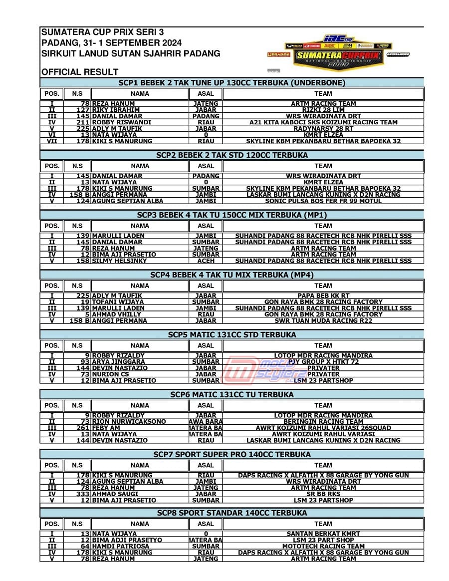 Management SCP pun berterima kasih kepada seluruh peserta, tim, mekanik, juga sponsor yang selalu kompak turut mensukseskan acara ini. Harapannya SCP dapat terus konsisten sebagai wadah olahraga balap motor, baik di Sumatera maupun tingkat nasional.
