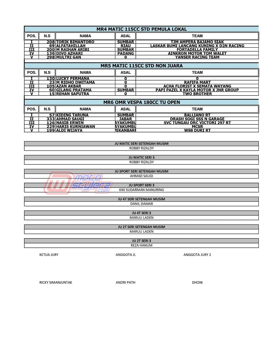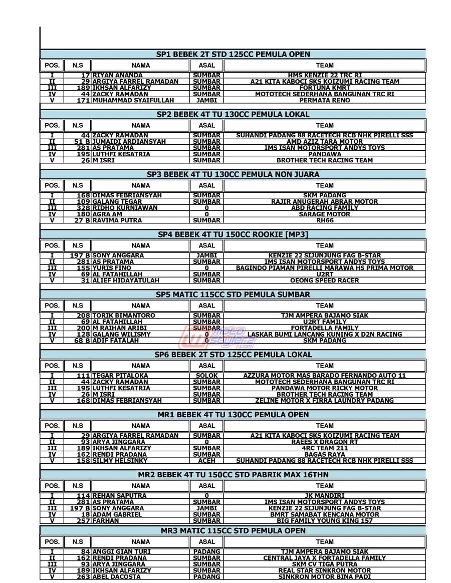 “Ini merupakan catatan positif dan menjadi bukti nyata jika SCP sangat dinantikan di Sumbar, khususnya bagi pembalap tuan rumah yang sudah lama menginginkan event kami hadir konsisten disini,”ucap kedua penggagas utama Sumatera Cup Prix.