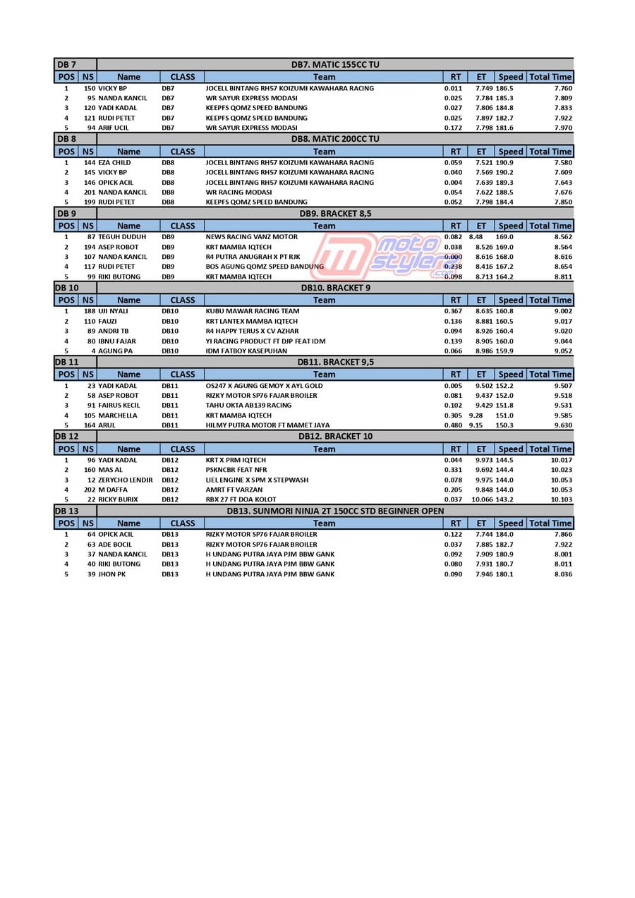 Berikut adalah hasil lengkap kejuaraan balap bertajuk Super Indonesia Drag Final Round Kejurda yang sukses dipentaskan pada hari Sabtu (14 Desember 2024) di Sirkuit NP Brigif 15 Kujang II Cimahi, Jabar. /MS