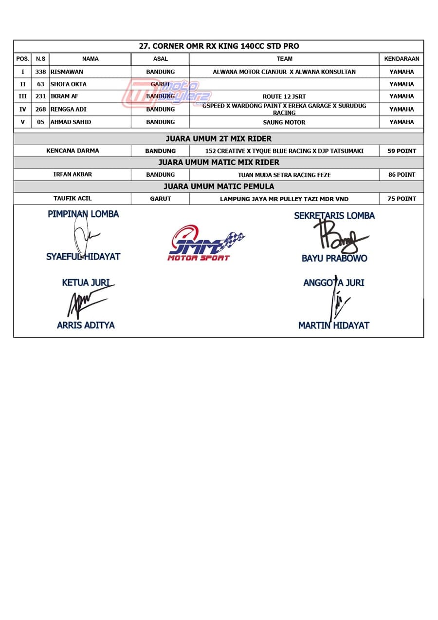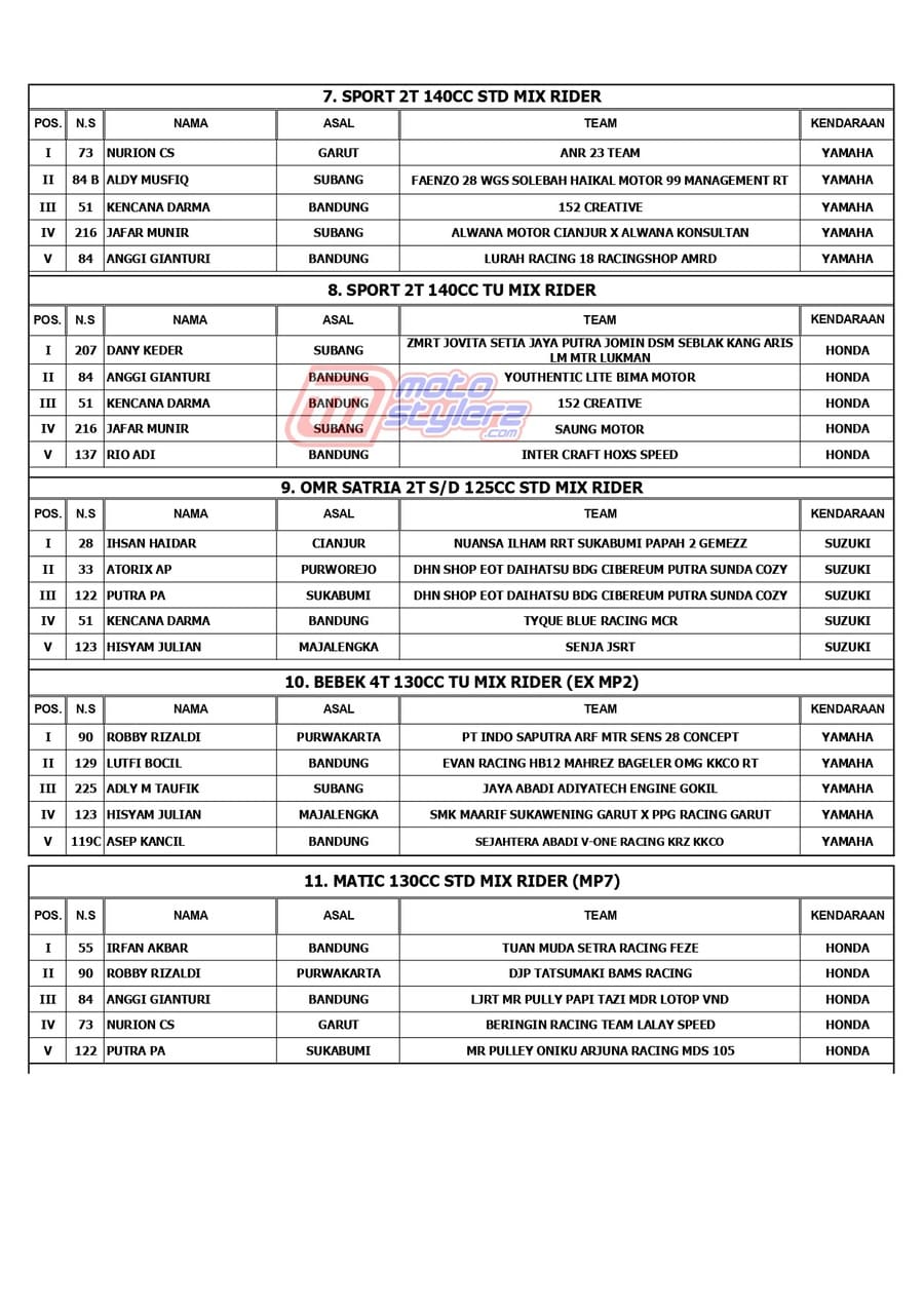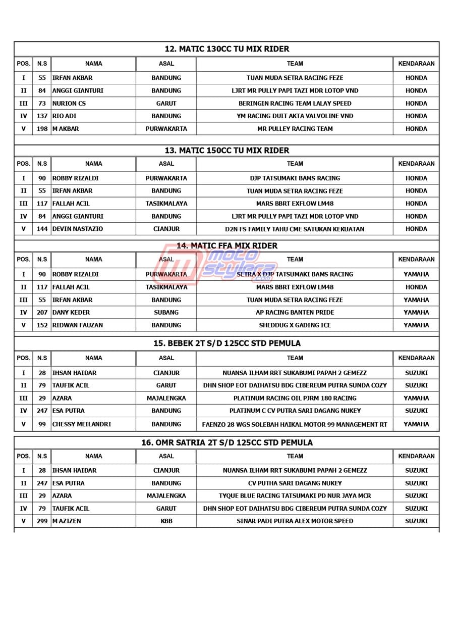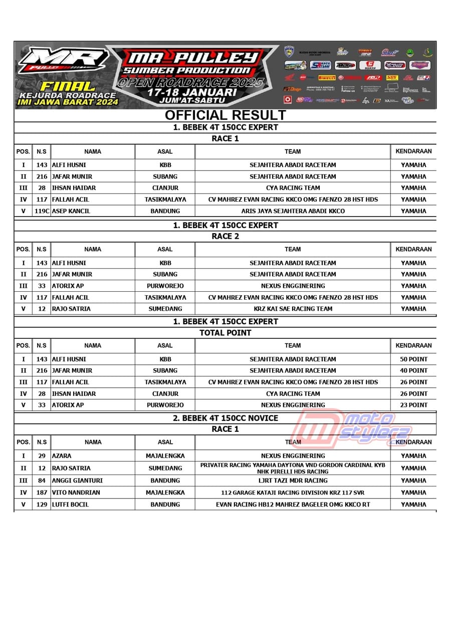 Berikut adalah juara lengkap event bertajuk MR Pulley Sumber Production Final Kejurda Road Race Jabar yang berlangsung sukses dipentaskan, Sabtu (18 Januari 2025) di Sirkuit Brigif 15 Kujang II, Cimahi. /MS