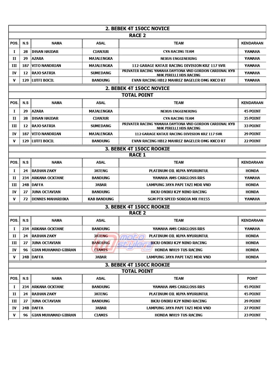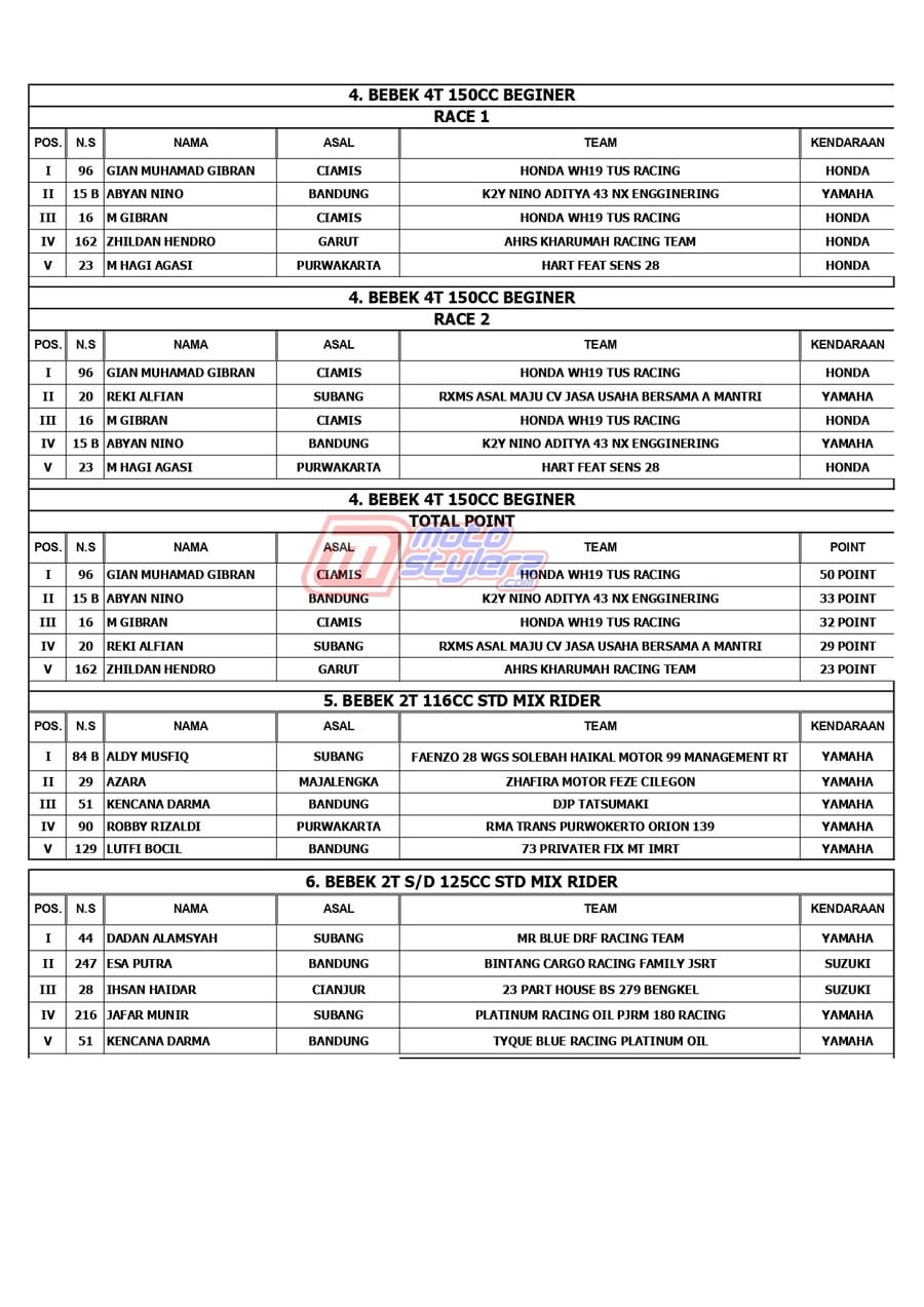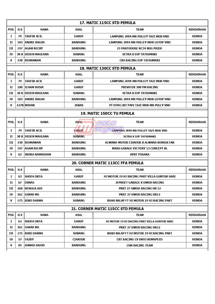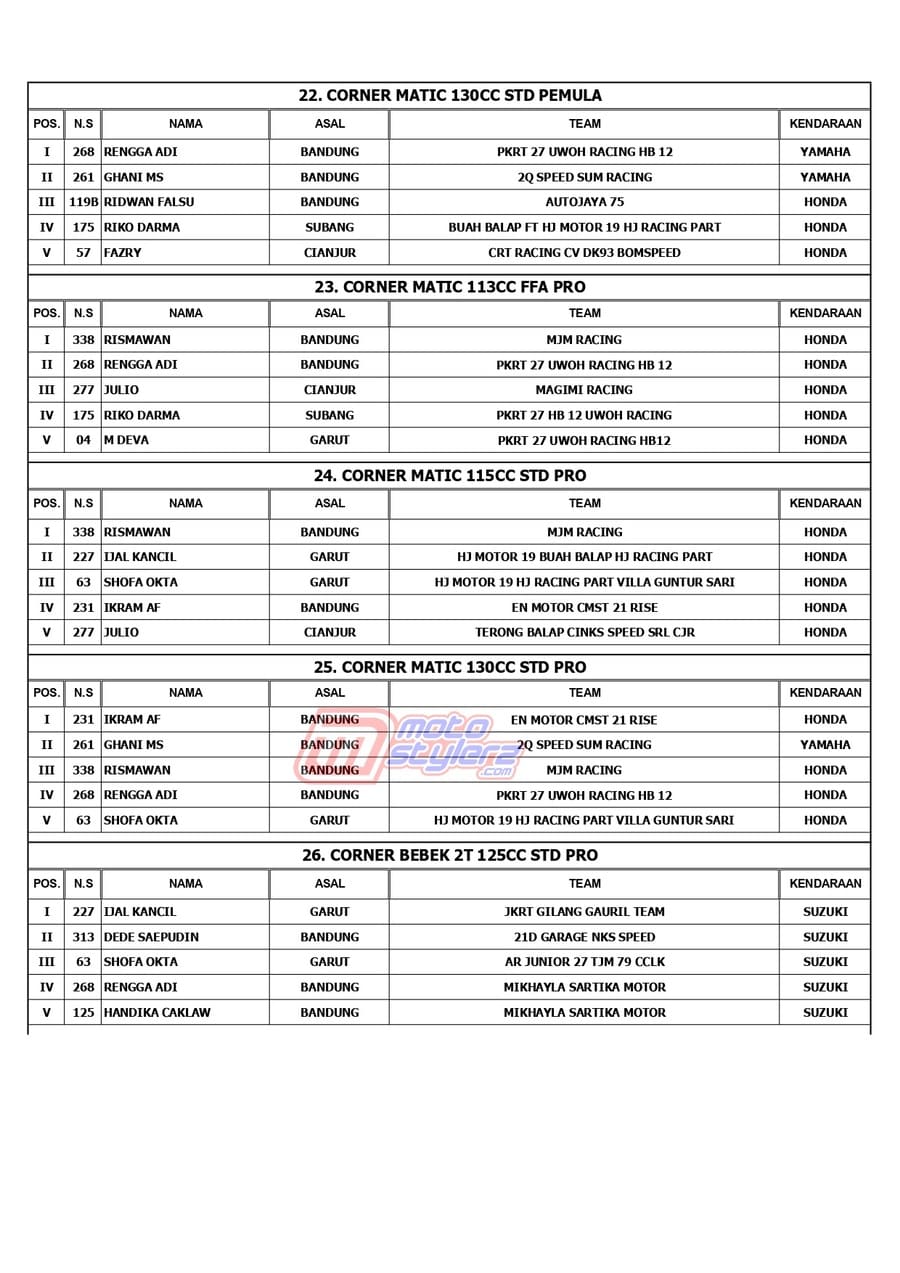 Berikut adalah juara lengkap event bertajuk MR Pulley Sumber Production Final Kejurda Road Race Jabar yang berlangsung sukses dipentaskan, Sabtu (18 Januari 2025) di Sirkuit Brigif 15 Kujang II, Cimahi. /MS