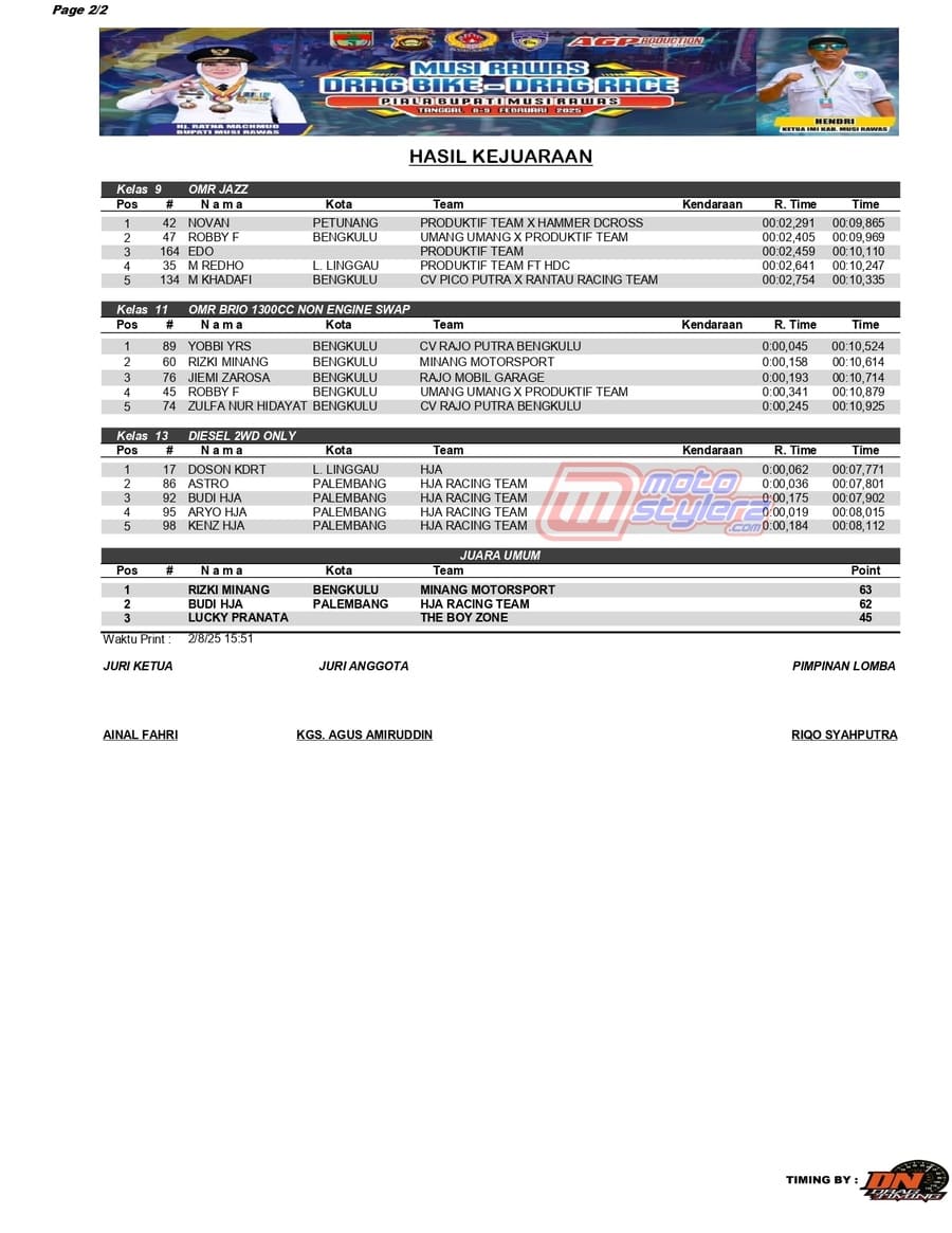 Berikut adalah juara keren event bertajuk Musi Rawas Drag Race, persembahan AG Production yang berlangsung pada hari Sabtu (8 Februari 2025) di Sirkuit NP Samping Polres Musi Rawas dengan diikuti 160 stater. /MS