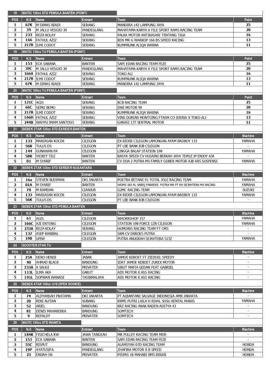 Berikut merupakan juara lengkap event UDRM Independent Cup Race yang sukses dipentaskan di Sirkuit NP KP38 Serang, Banten (3-4 Mei 2025). /MS