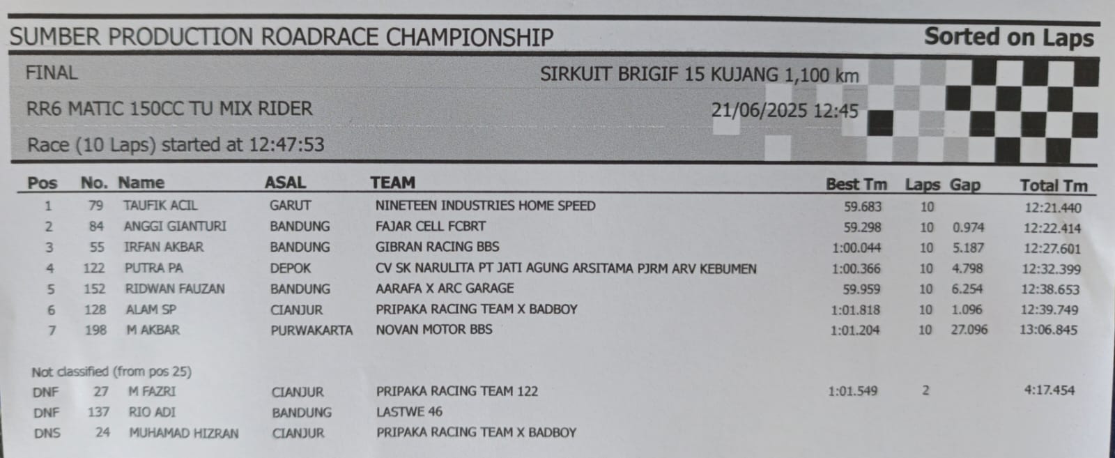 Kolaborasi tim Fajar Cell X FCBRT dengan mempercayakan joki Anggi Gianturi sukses bikin gempar kalender Sumber Production Road Race Championship dengan menyabet 1 podium bergengsi saat dilangsungkan panas pada hari Sabtu (21 Juni 2025) di Sirkuit NP Brigif 1 Kujang II Cimahi, Jabar.