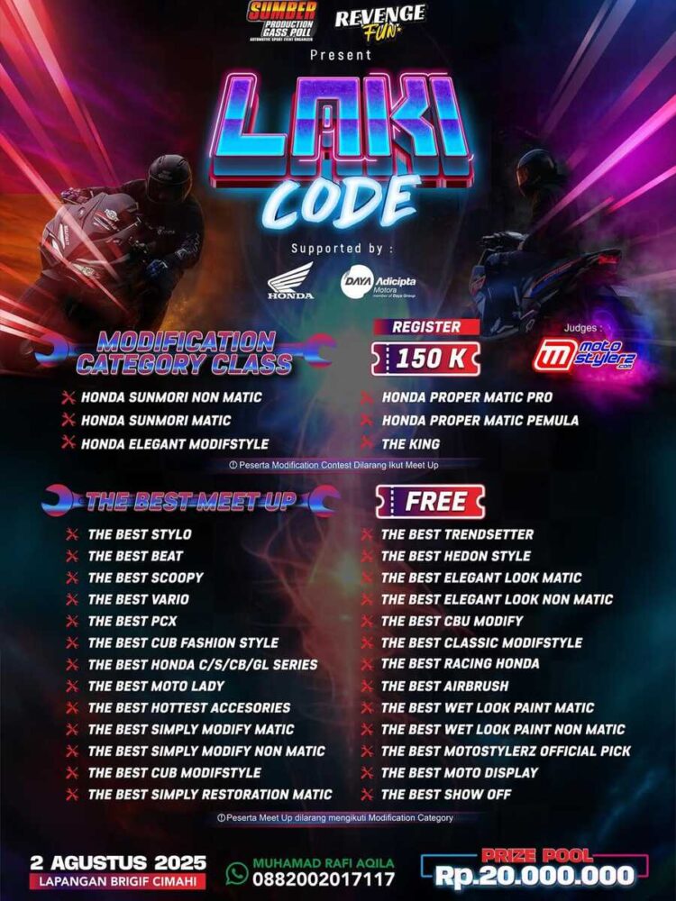 Revenge Fun, komunitas sepeda motor yang mulai sering menunjukan aktifitas riding di wilayah Bandung Raya dan Cimahi pada hari Sabtu (2 Agustus 2025) mendatang siap menghelat agenda Modif & Meet Up Contest khusus sepeda motor Honda dengan tajuk “Laki Code” yang akan diselanggarakan di area Sirkuit Brigif 15 Kujang II, Cimahi.