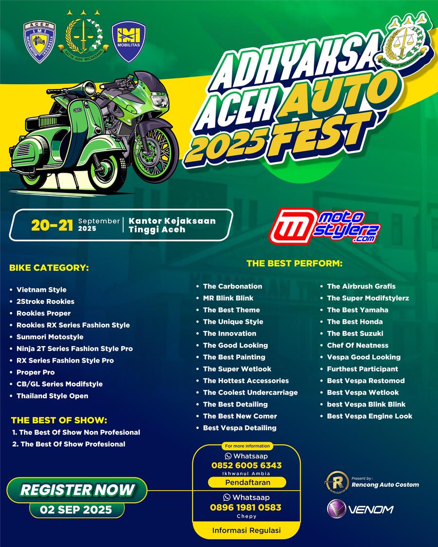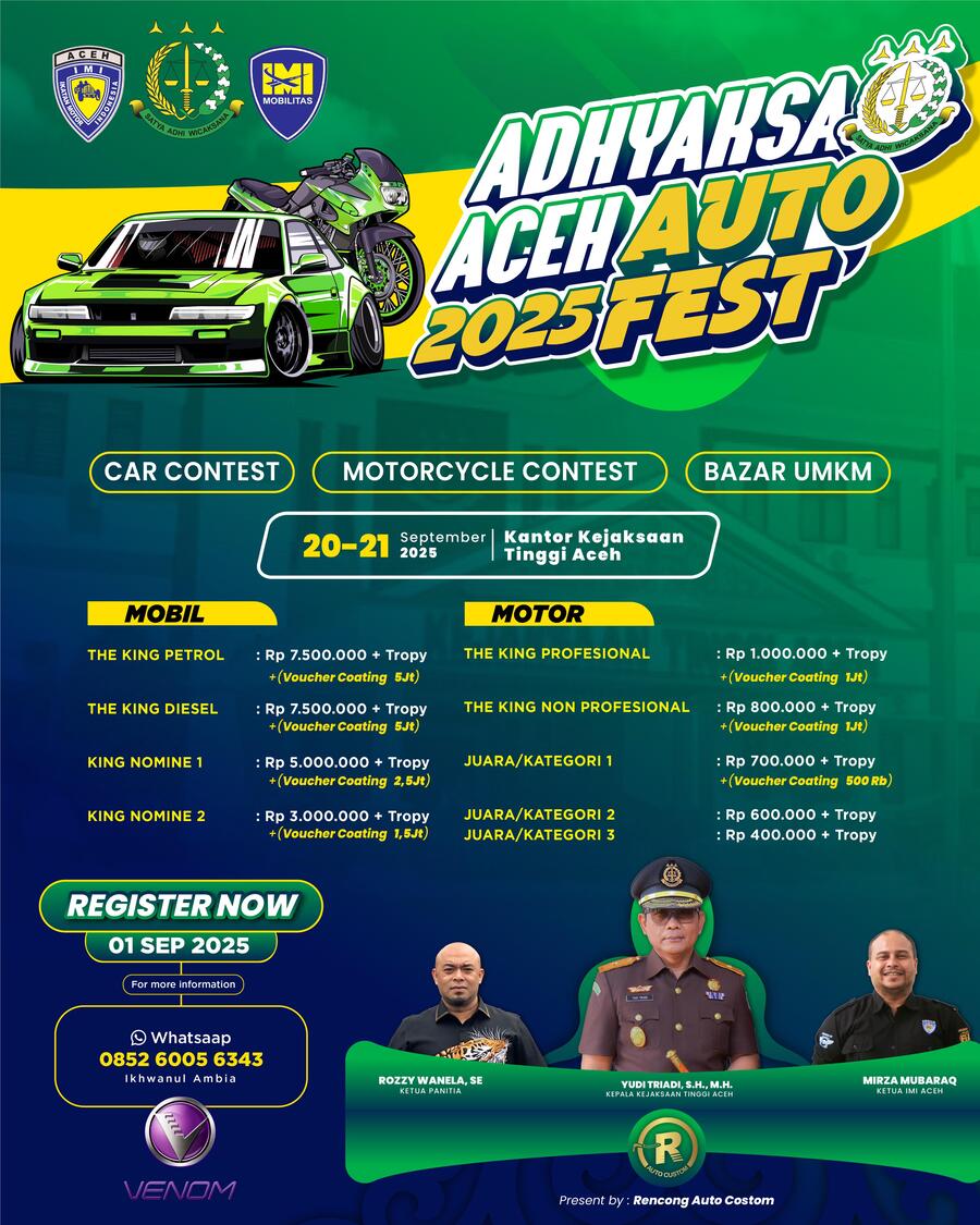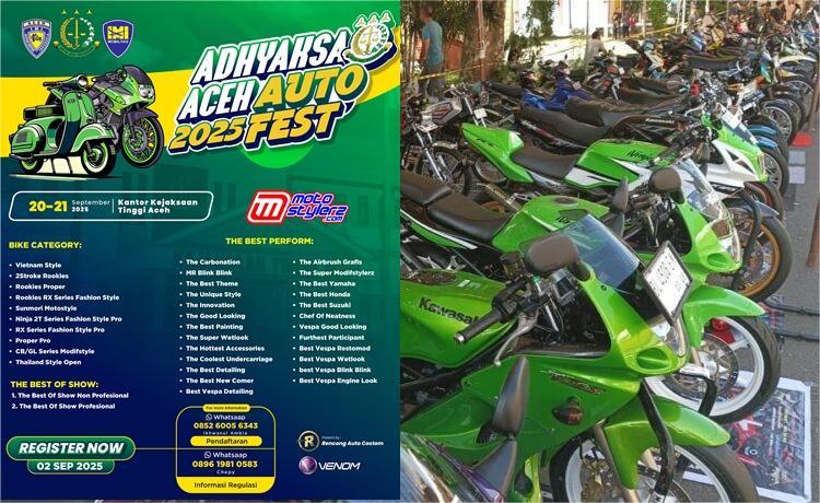 Dunia otomotif se Provinsi Aceh, khususnya pecinta modifikasi motor serta modifikasi mobil siap kembali berpesta dalam kalender event bertajuk Adhyaksa Aceh Auto Fest yang akan dipentaskan selama dua hari, Sabtu dan Minggu (21-22 September 2025) dengan mendaulat area Kantor Kejaksaan Tinggi Aceh.