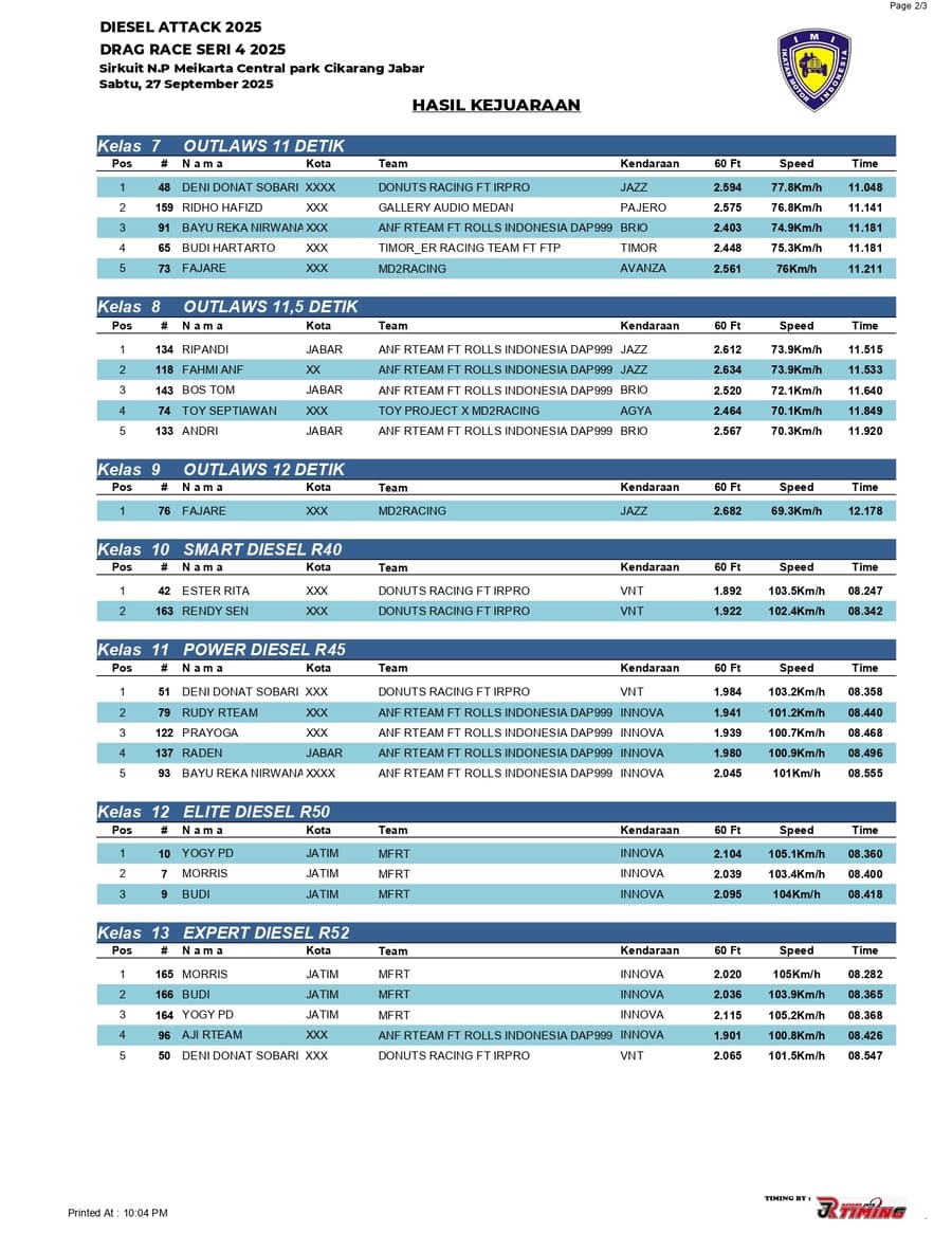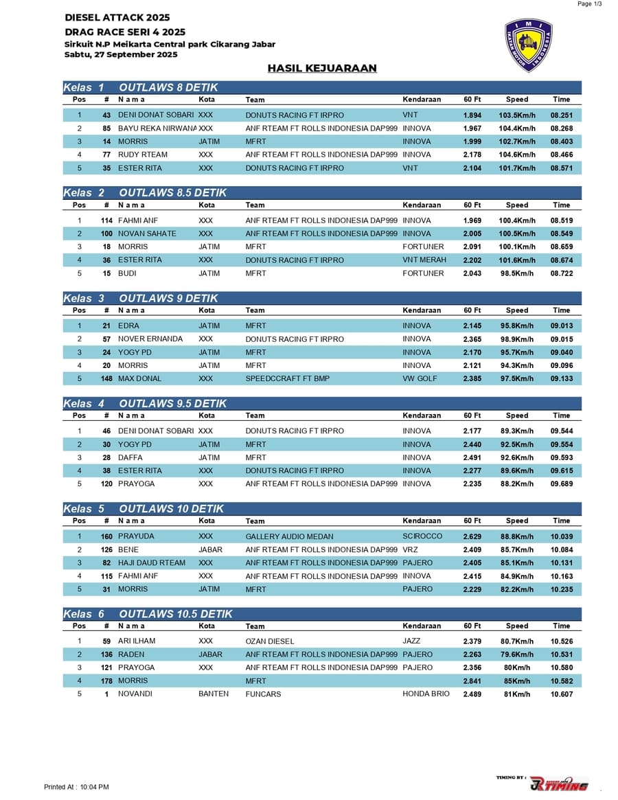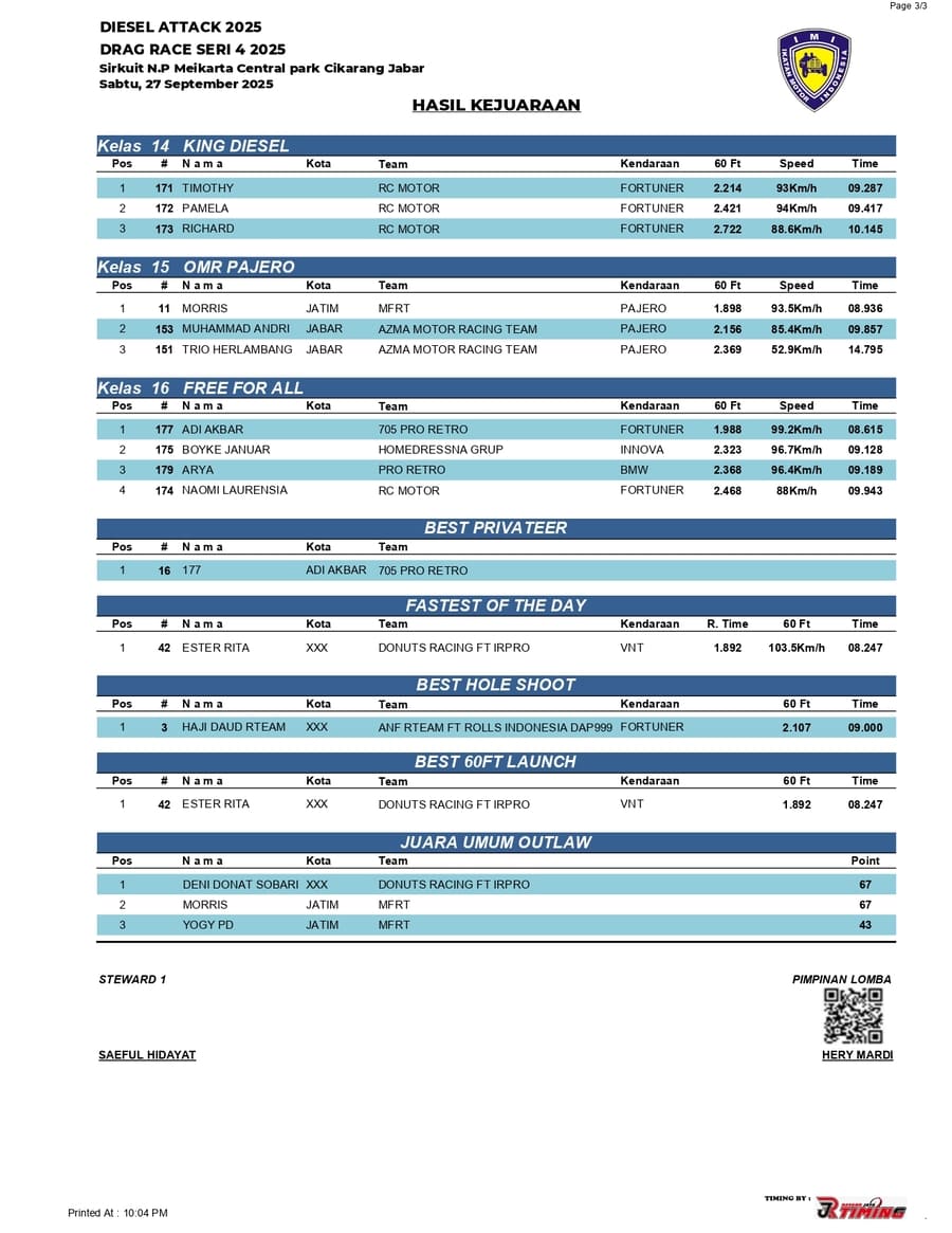Berikut adalah jawara all class di even bergengsi Diesel Attack Drag Race Series yang sukses dipentaskan pada hari Sabtu (27 September 2025) di Sirkuit NP Meikarta Central Park, Cikarang, Jabar. /Threeyadi
