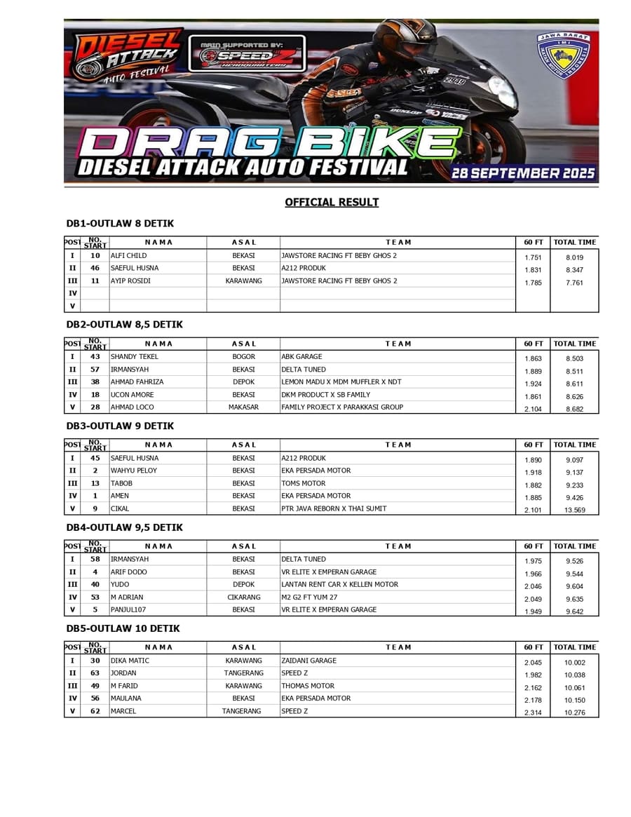 Berikut adalah jawara all class Diesel Attack Drag Bike Auto Festival yang berlangsung sukses diselenggarakan hari Minggu (28 September 2025) di Sirkuit NP Meikarta Central Park, Cikarang, Jabar. /Threeyadi