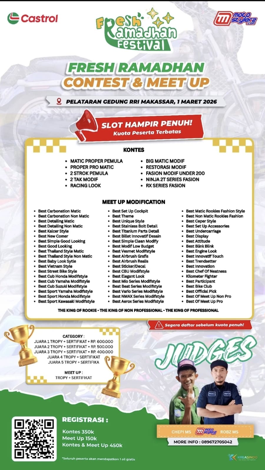 Seluruh peserta yang sudah terdaftar bakal mendapatkan 1 Oli Castrol secara GRATIS brodi. So, segera daftarkan maskot terbaik kalian di Fresh Ramadhan Contest & Meet Up di Kota Makassar.
