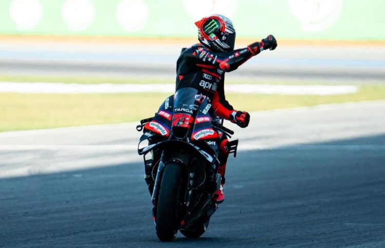 Marco Bezzechhi bersama Aprilia langsung gasspoll saat melakoni race utama MotoGP sekaligus memberikan kemenangan dasyat bagi timnya di Sirkuit Buriram, Thailand (1 Maret 2026).