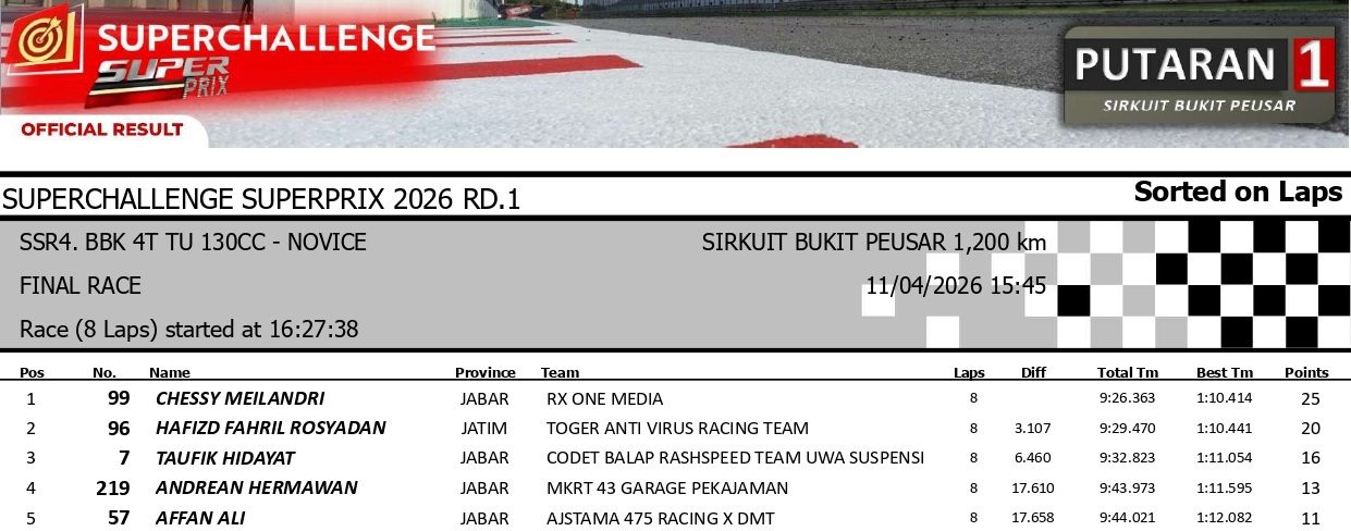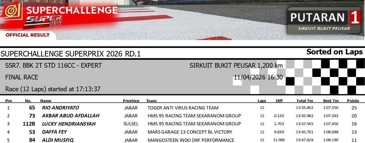 Berikut adalah hasil lengkap even balap bertajuk Superchallenge Superprix Putaran 1, persembahan Genta Auto Sport yang berhasil dipentaskan meriah 10-12 April 2026 di Sirkuit Bukit Peusar, Tasikmalaya. /Threeyadi
