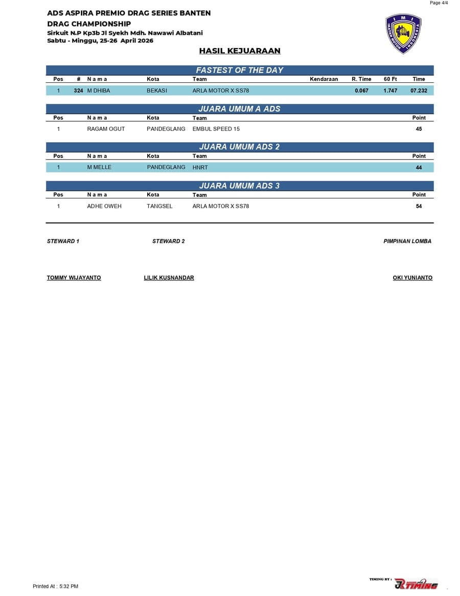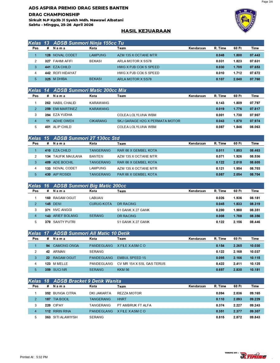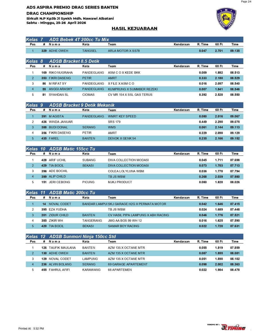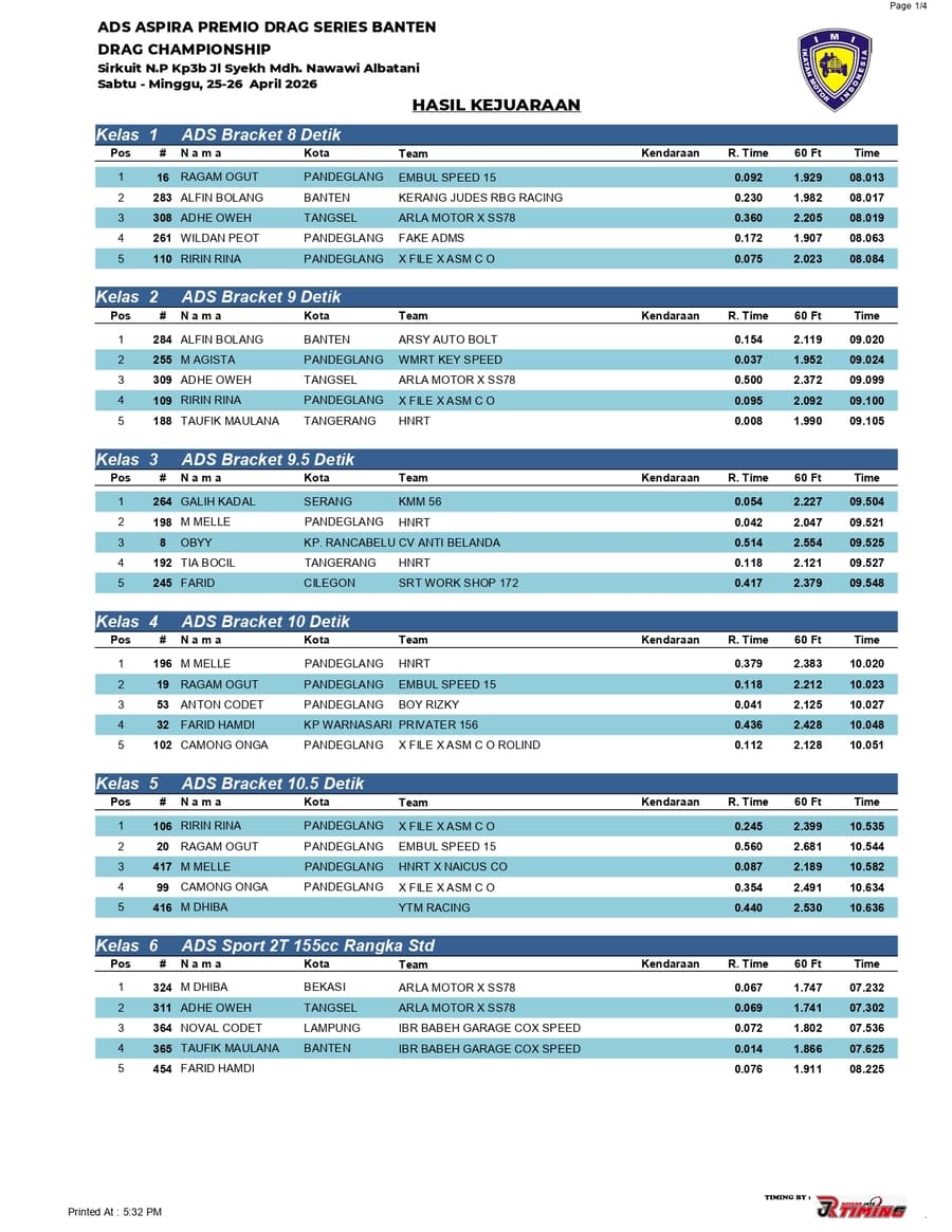 Berikut adalah hasil lengkap juara di seluruh kelas even ADS Aspira Premio Drag Series yang berlangsung sukses ditayangkan di Sirkuit NP KP3B, Jl Syekh Mdh Nawawi Albantani, Banten (25-26 April 2026).