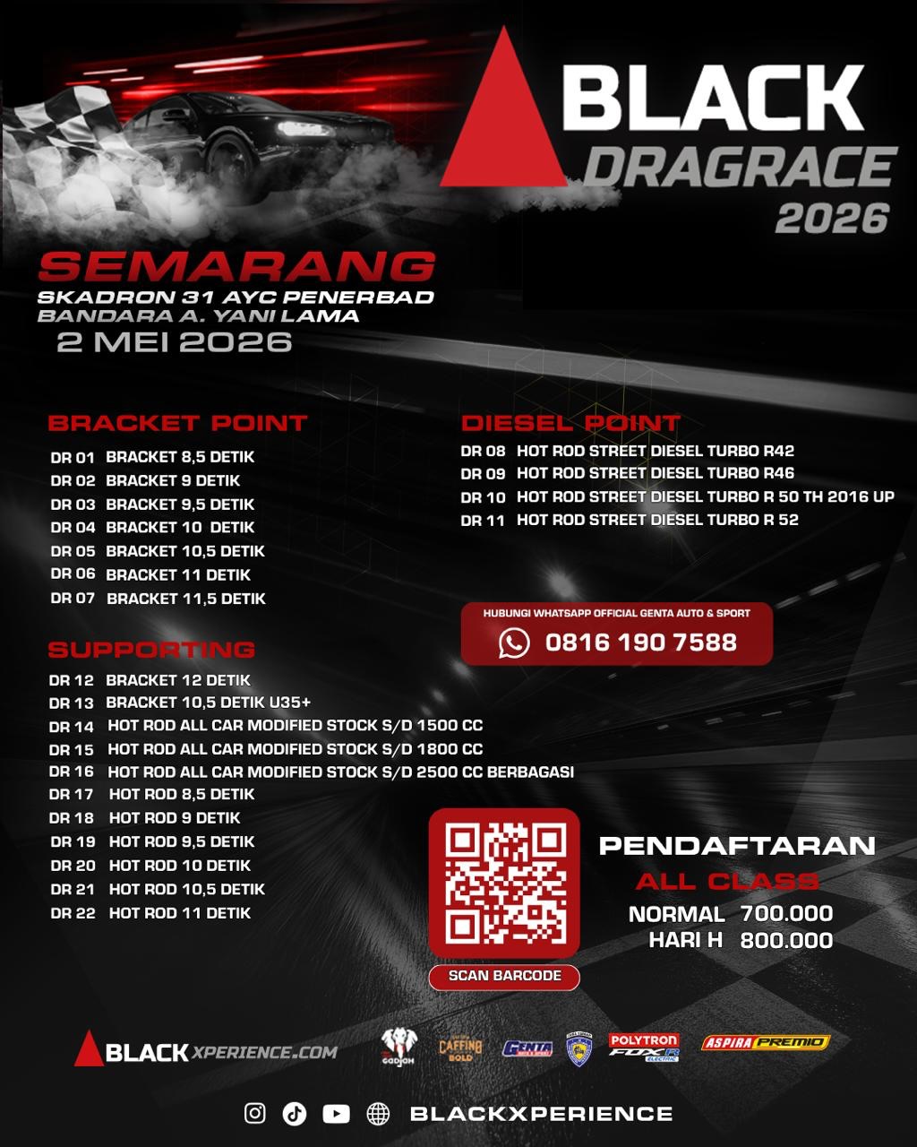 Informasi seputar even Black Drag Bike & Black Drag Race, pendaftaran, jadwal, regulasi dan lainnya, kalian bisa merapat langsung dengan menghubungi 0816-190-7588 atau scand barcode yang sudah tersedia. Pokoknya kalian wajib hadir brodi dan ajak seluruh teman serta keluarga.